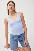 Meet your new go-to tank top: the UB BASICS: MILES AHEAD TOP! Made with soft and stretchy jersey fabric, this tank top not only offers comfort but also a flattering V-neck and sleeveless style. Perfect for pairing with shorts and sneakers, it's double lined for added durability. Get ready to rock your next workout or casual day out in style!