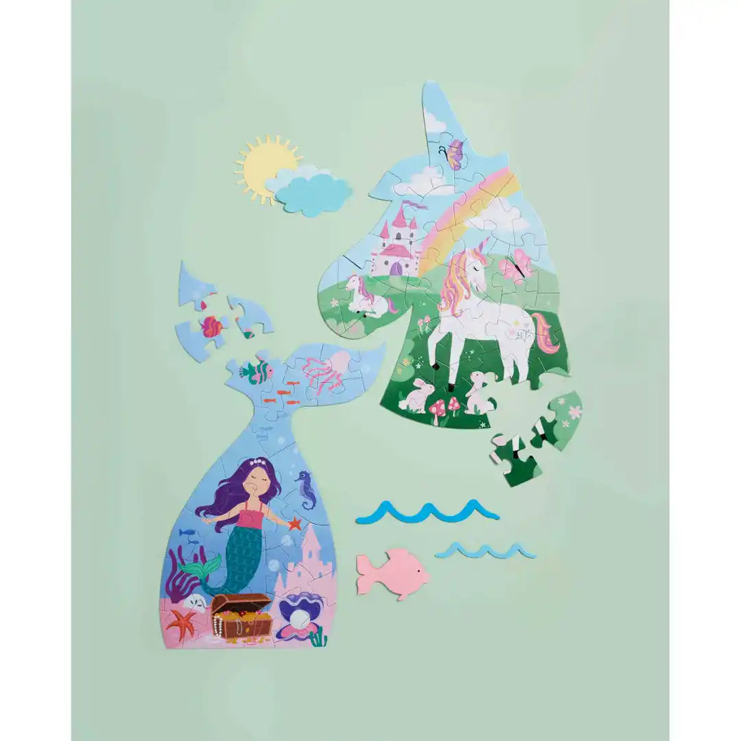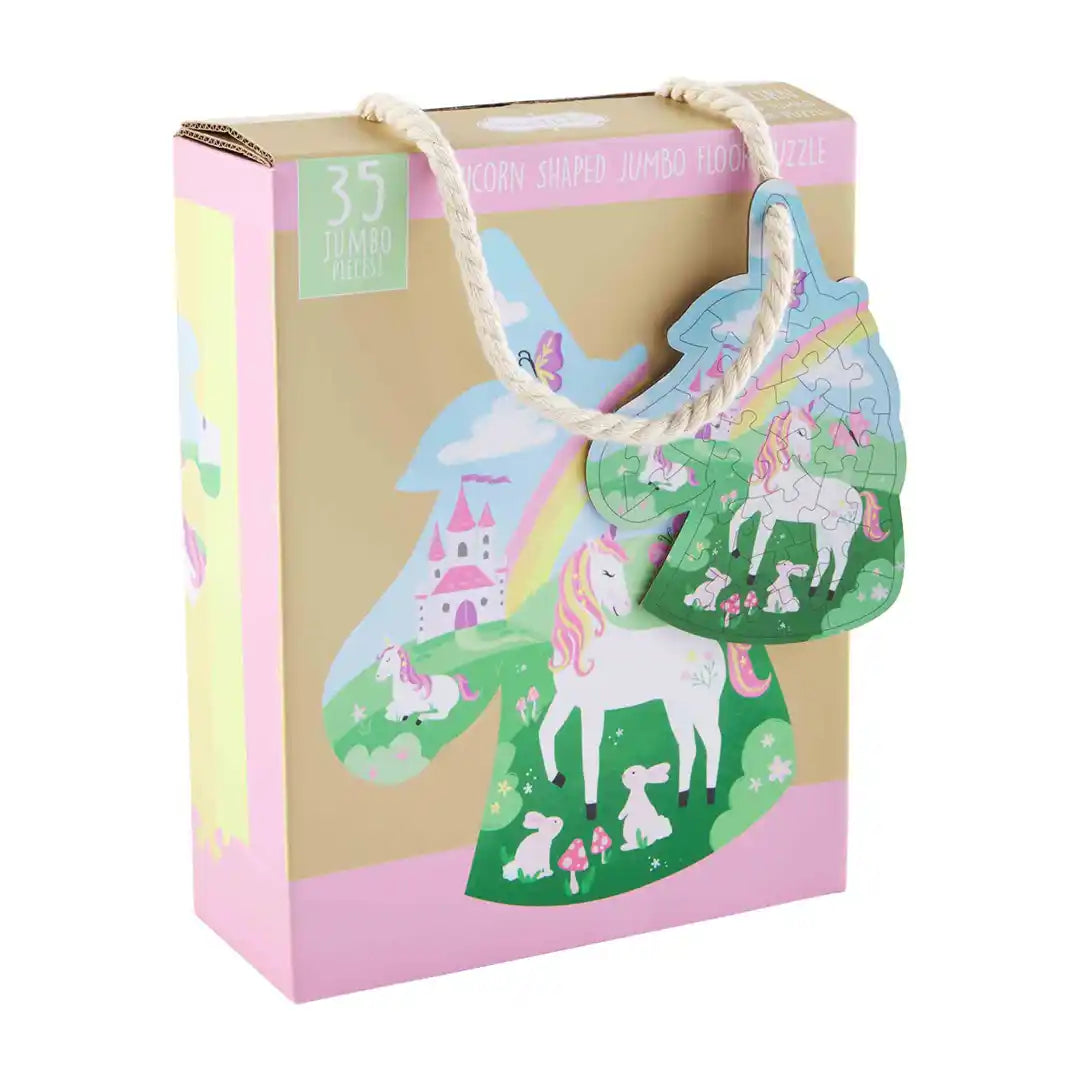 The Unicorn Shaped Floor Puzzle forms a familiar shape for floor puzzling fun! The 35-piece jumbo floor puzzle comes in a cardboard storage box. The box features a rope handle. The finished puzzle forms familiar shape that your little is sure to love. This puzzle is intended for children ages 3 and older.