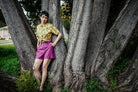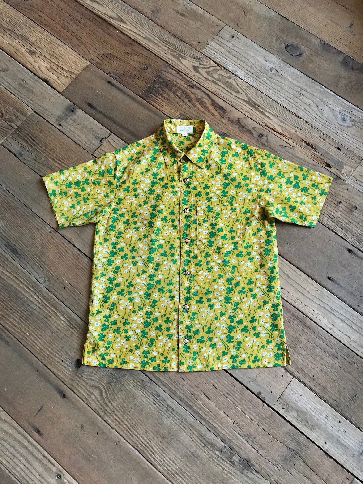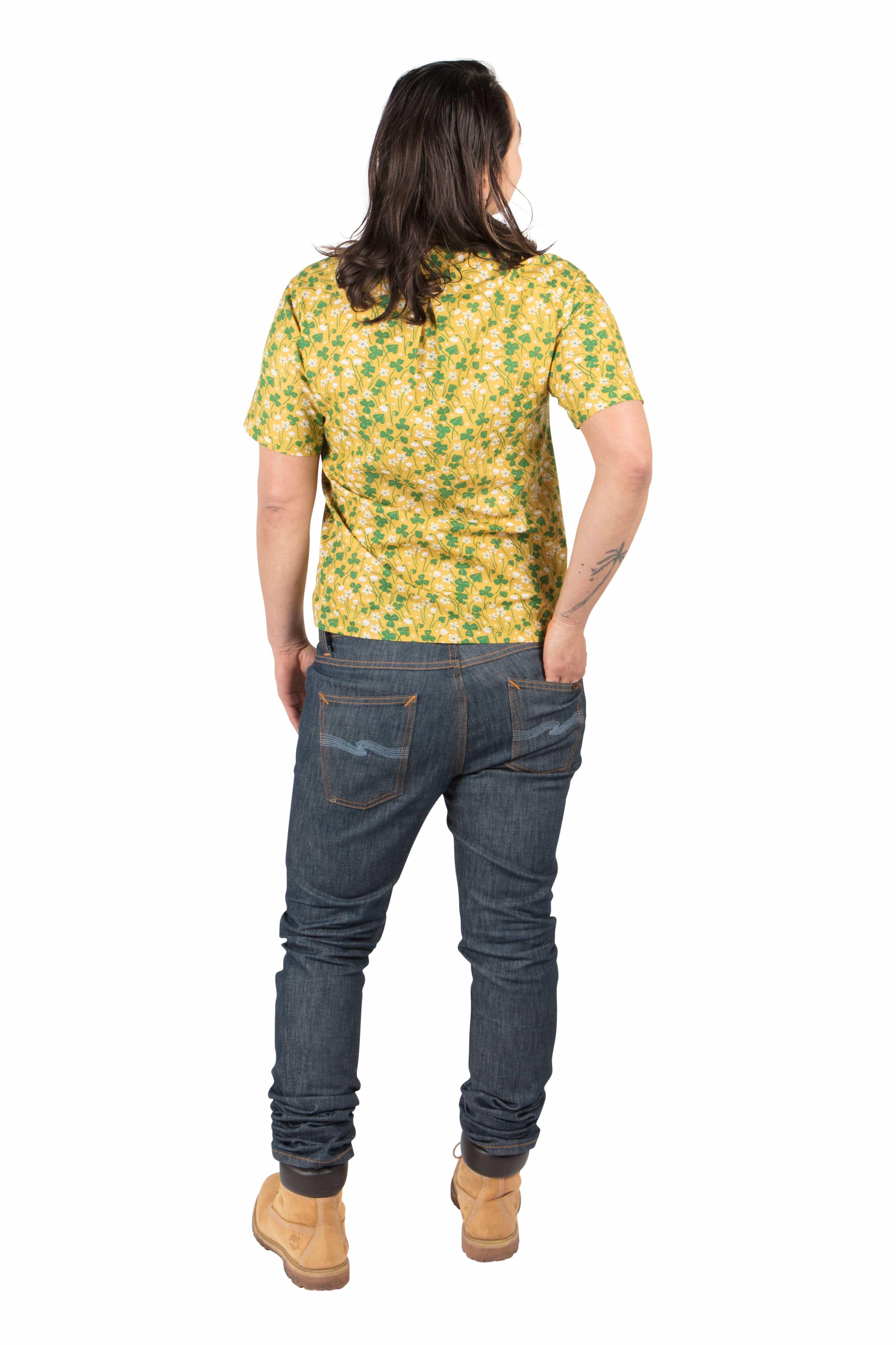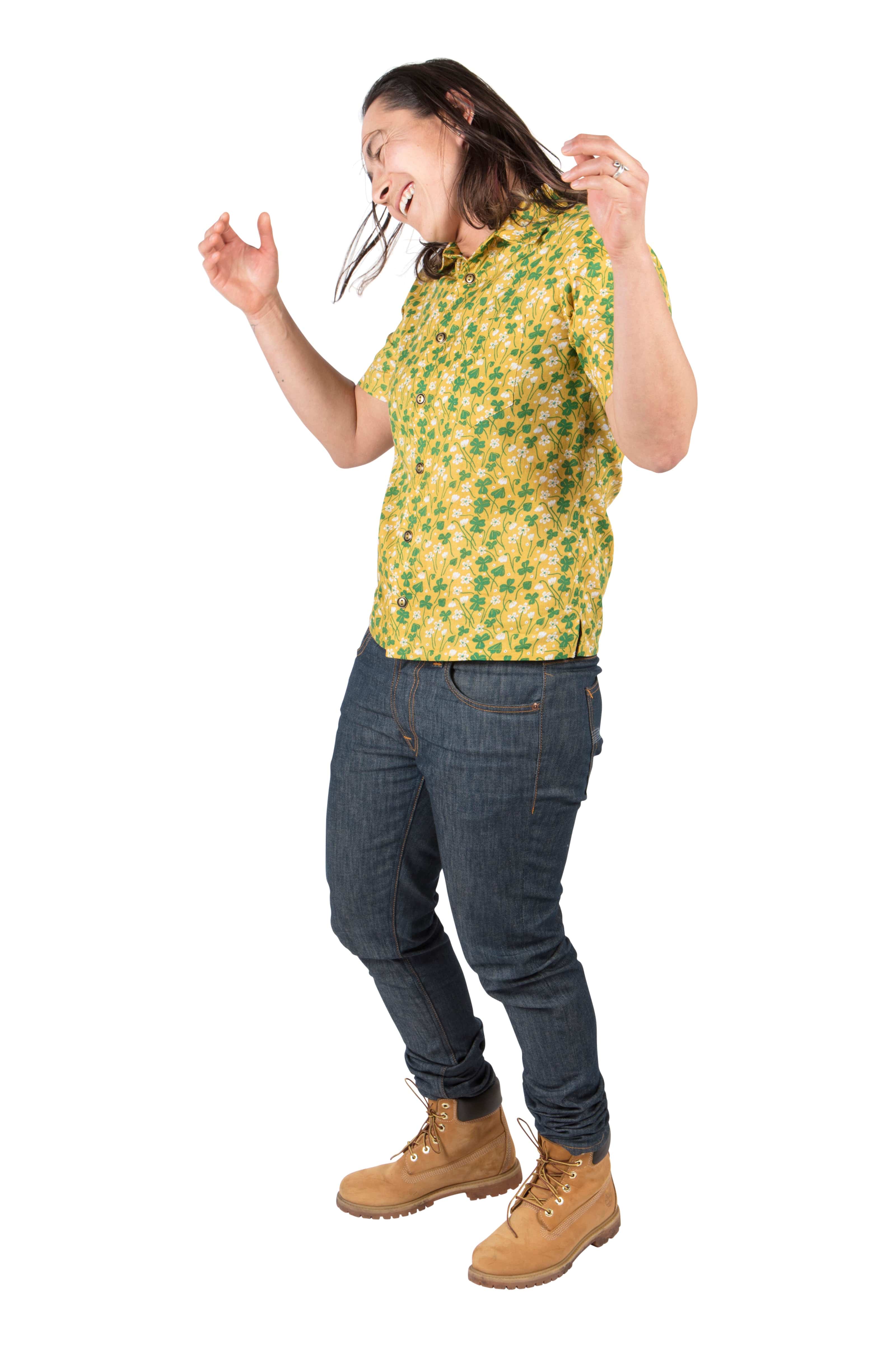 Our first unisex top. Short sleeve with a over sized fit. Straight collar and front pocket. 7 buttons, made of are our signature deadstock brass. Wear tied up for a more cropped-feminine look, or straight down for a more butch look.