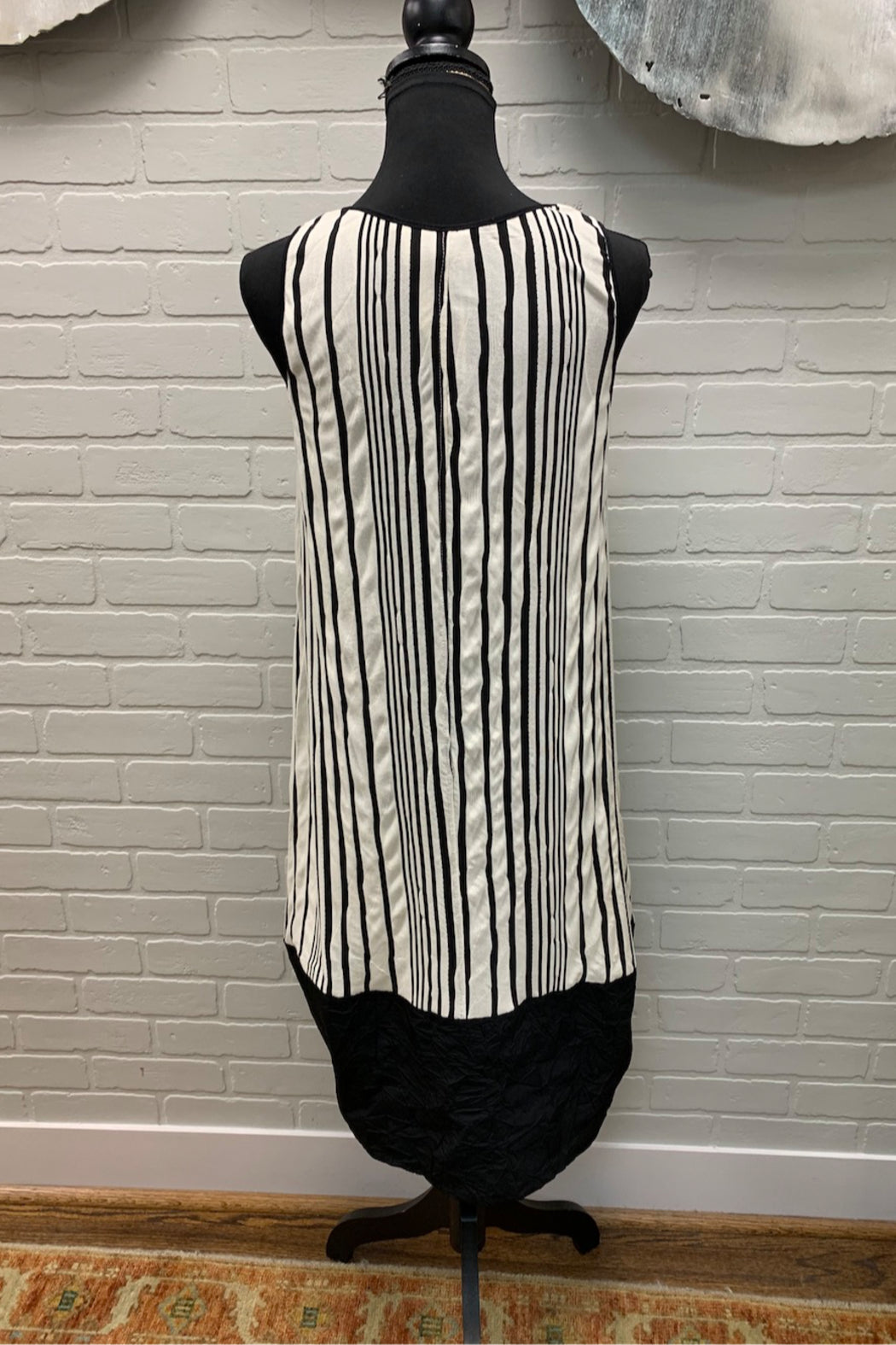 Super soft, super easy crinkle fabric with uneven black/cream stripes. Assymetrical hemline with black border and black trim.