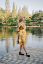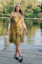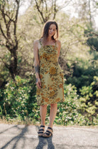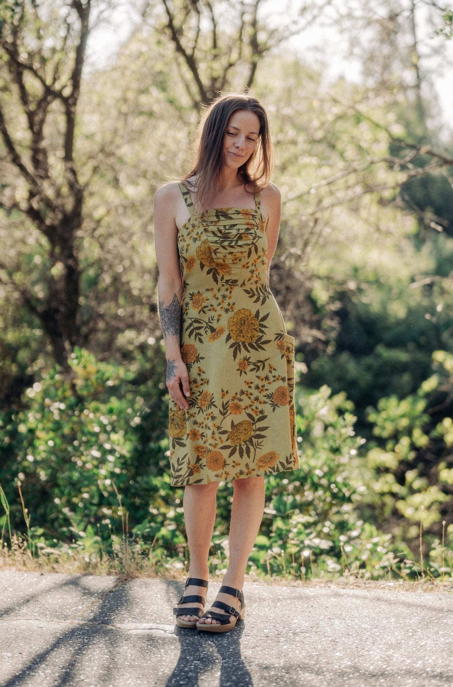 Made from a mustard yellow colored linen blend fabric 55% linen/ 45% rayon with Marigold flowers.