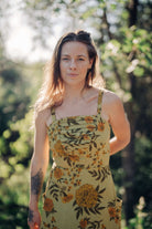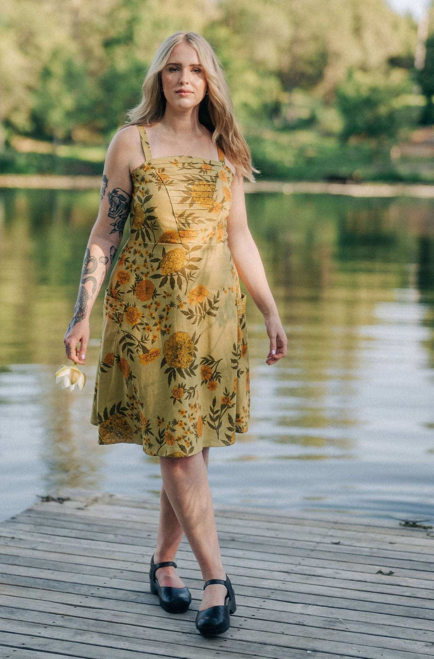 Fabric made in Collaboration with Karalyn Wysocki of Needlebone. Karalyn hand drew and colored the marigolds and we had them printed on to this yummy linen / rayon blend fabric in Los Angeles CA in a small batch and we won't be reprinting! So if you got your eyes on this super special design I would recommend jumping on it while you can.