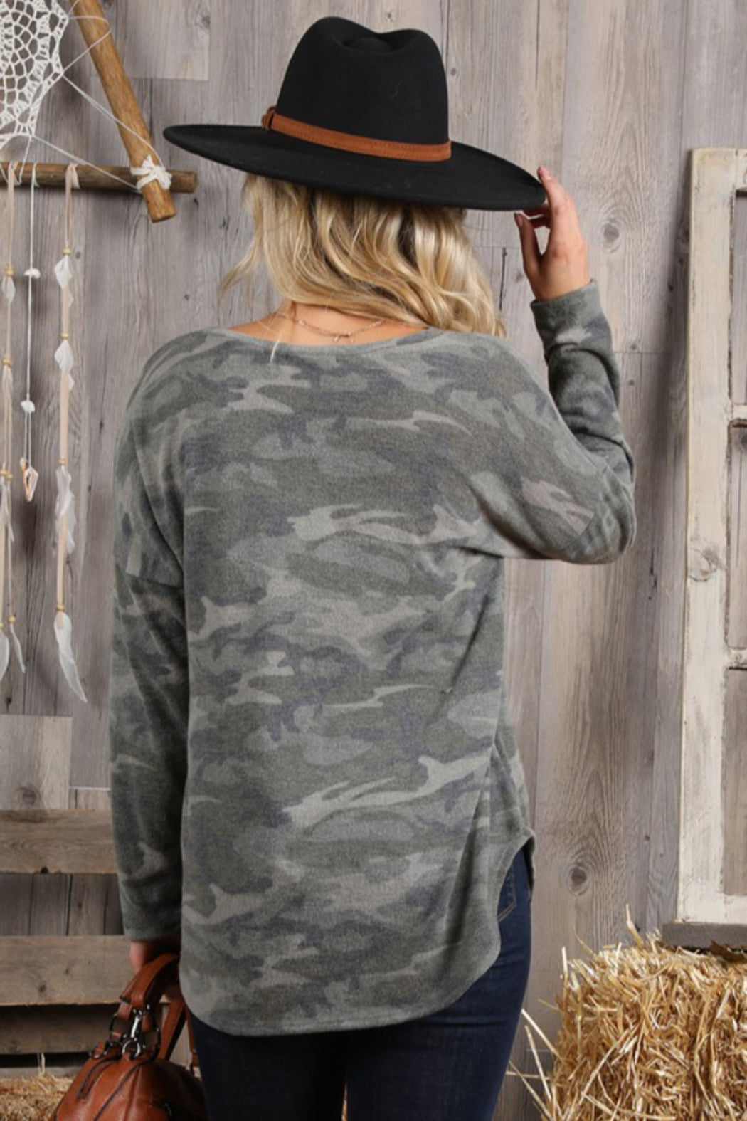 This v neck, long sleeve, brushed hacci, camo top with a u hemline is a must to add to your wardrobe. Pair it with your favorite jeans or leggings to complete the look