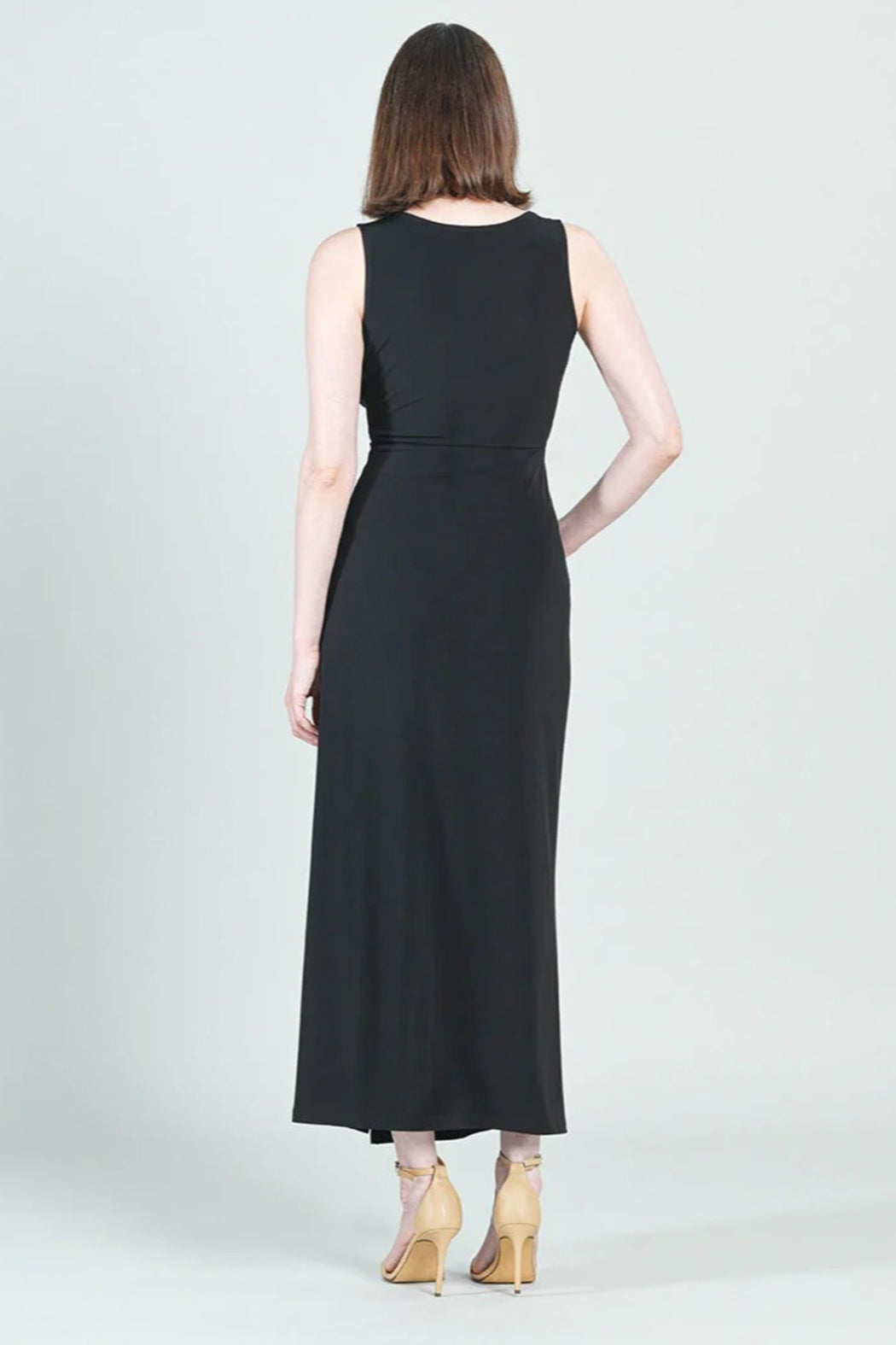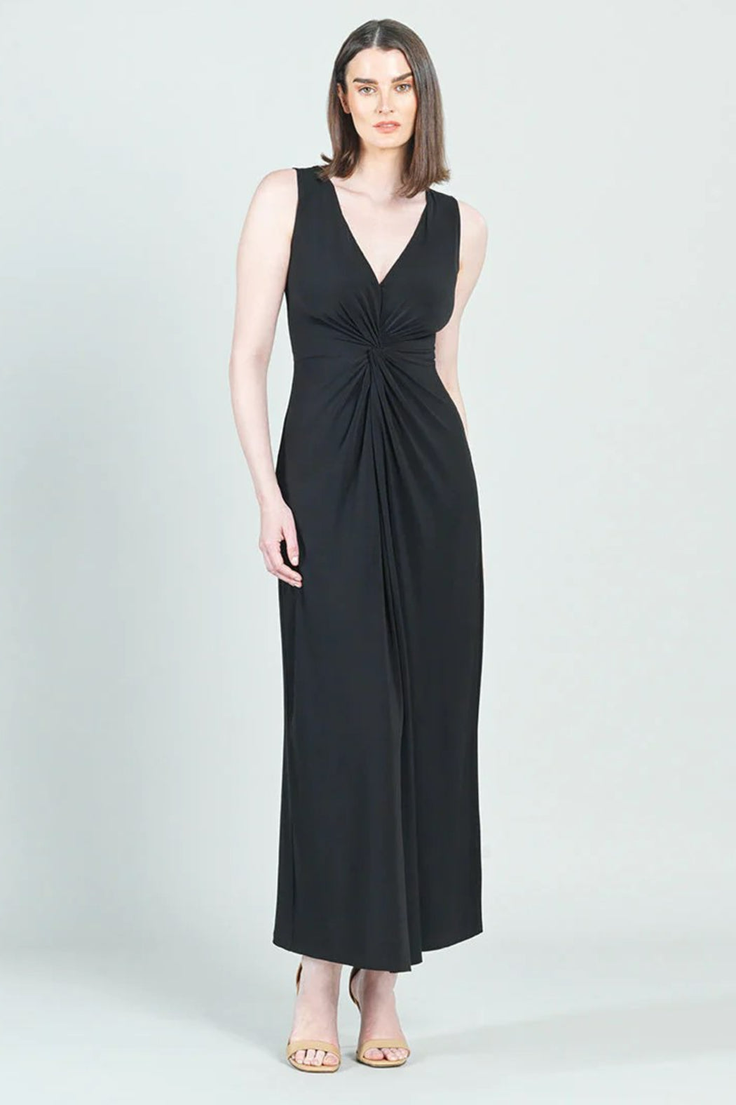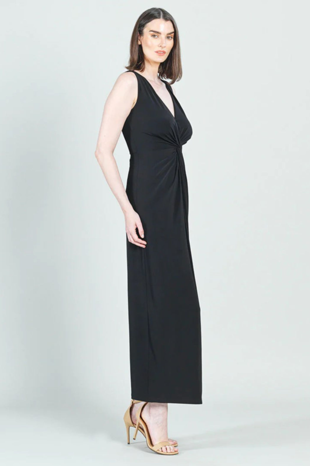 This stunning sleeveless dress features a deep v-neckline, wide shoulder coverage, and a knotted twist bodice detail, that accentuates the waist while creating a flattering draped silhouette, with a 24" front center slit and flowing maxi hemline.