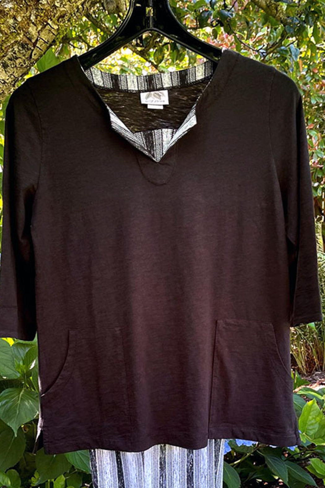 Pockets are so welcome and in this shorter length top we have them at the hemline. The elbow length sleeves and inner neckline are trimmed with the matching striped fabric. A notch neckline has a tiny fill so that it's not too deep. Wild Palms is cut on a boxy, comfort pattern for a cut like a traditional sweatshirt that's ideal for many. Cotton slub jersey knit is a lightweight fabric. The drawing looks longer than the shirts will actually be. Look to the photos.