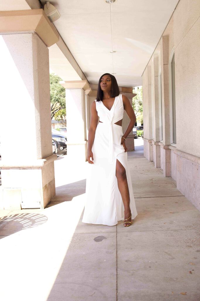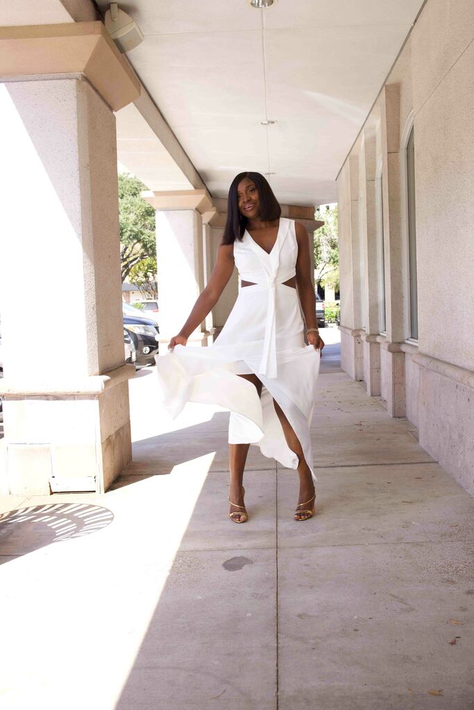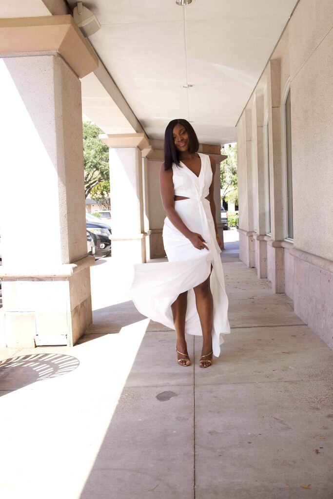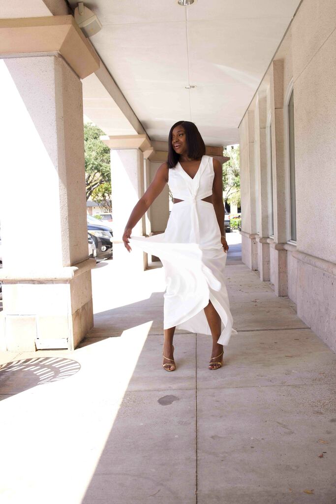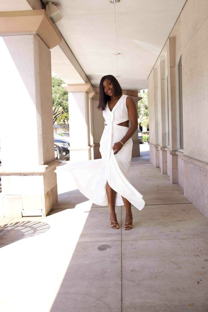 - The Vale Dress is a timeless design crafted with chic and sophisticated details. The waist cut outs and low cut collar create a flattering silhouette, making it the perfect choice for any special occasion. Made of quality white fabric, this elegant dress will guarantee a timeless look.