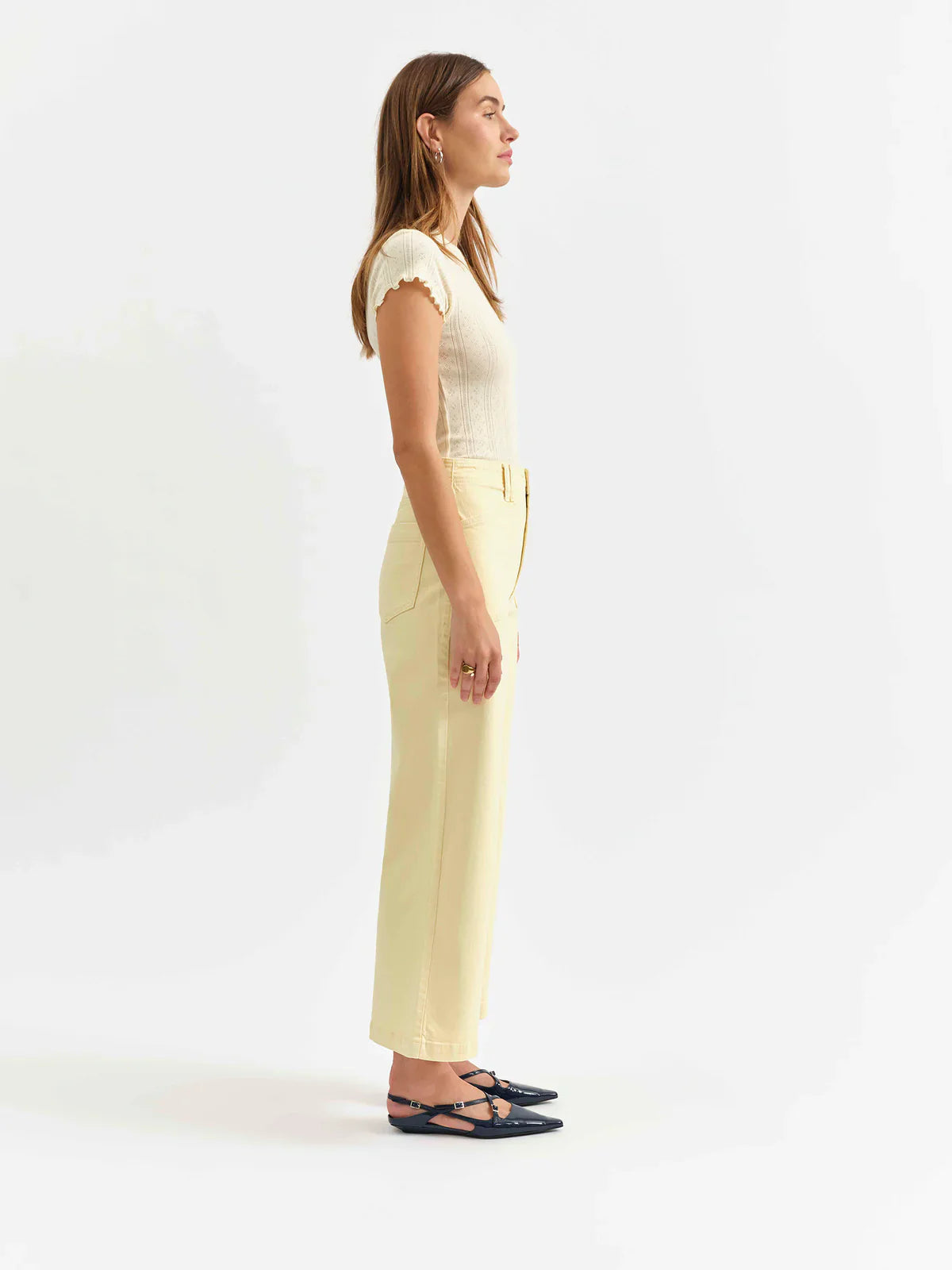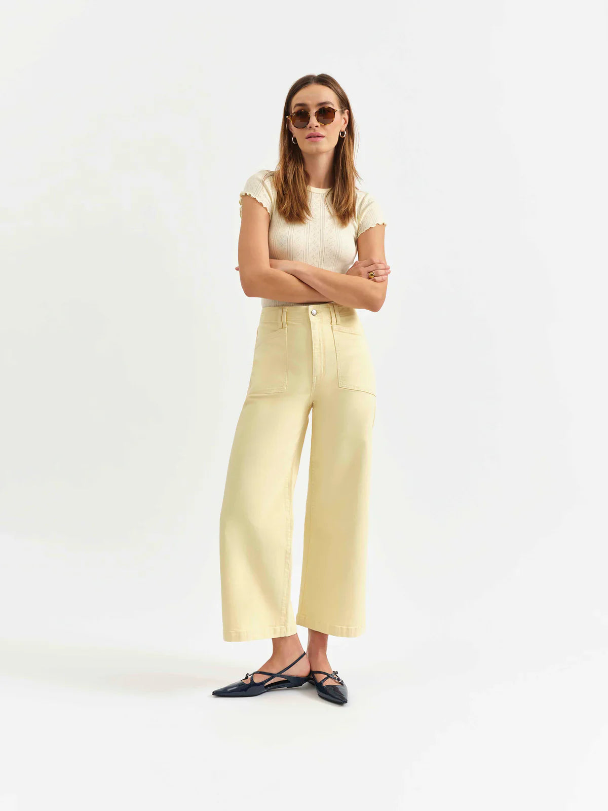 Inspired by LA's hottest neighborhood, the Valley Girl in Sunny is a high rise wide leg featuring retro-inspired patch pockets and a butter yellow wash. Constructed from our Tough Love fabric, this jean holds its shape but yields to your body in all the right ways.