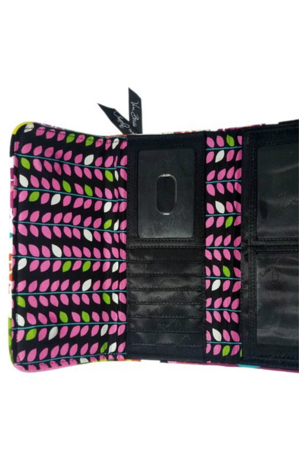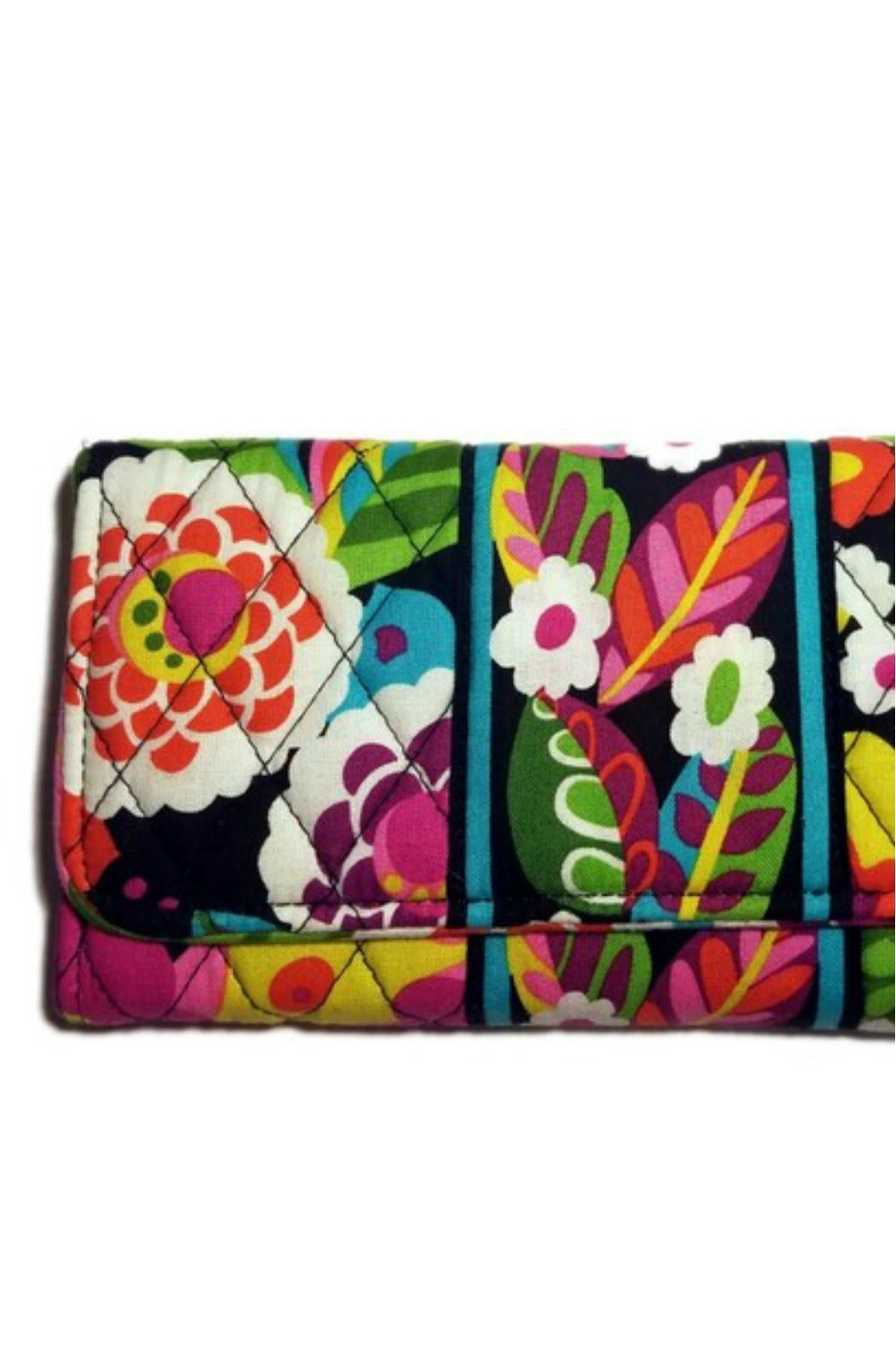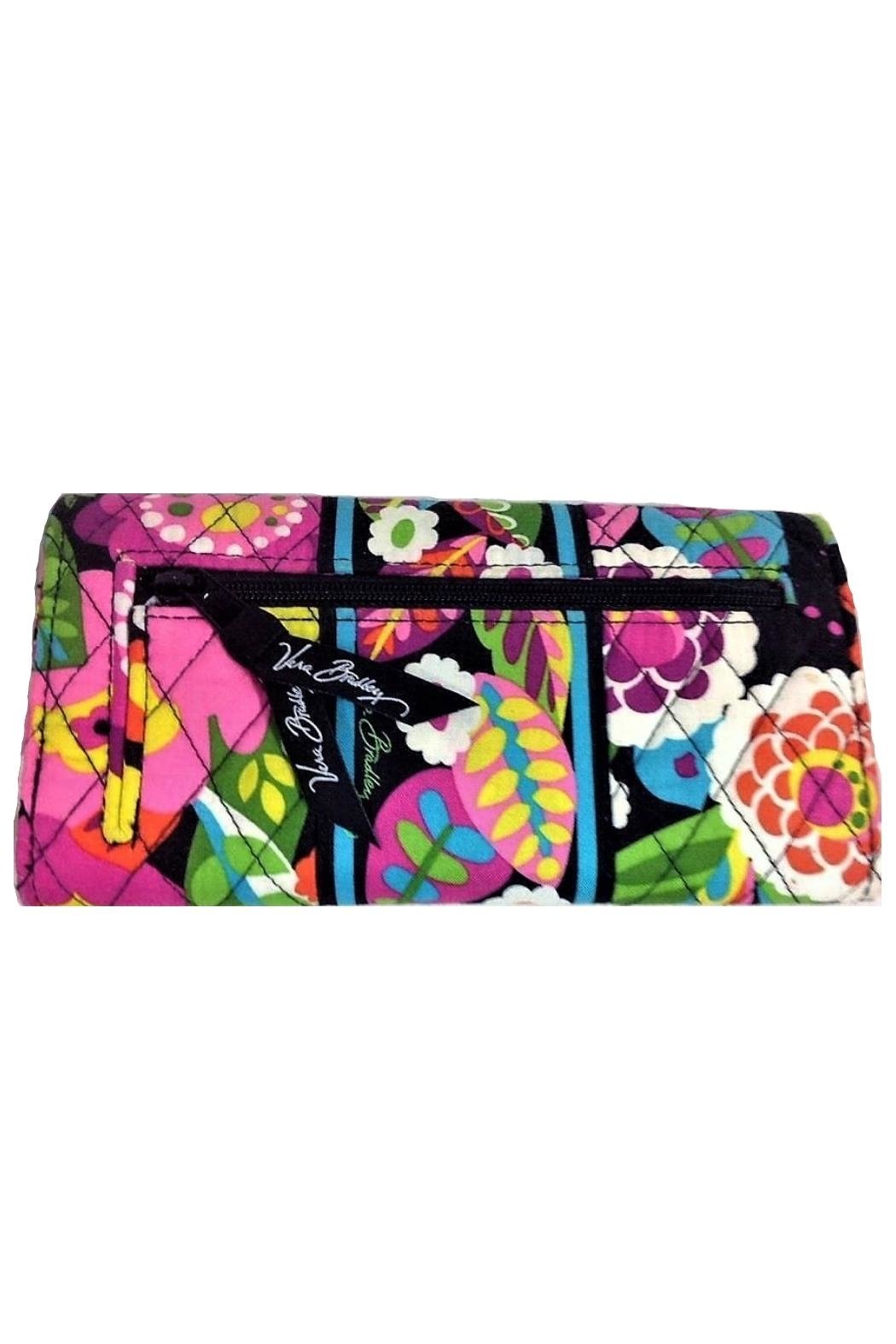 Meet the Vera Bradley Gallery Wallet in the Va Va Bloom pattern, with a slim but mighty design. The "gallery" trifold has a few perks that an ordinary trifold doesn't have. The front flap closes with a magnetic snap, and on the back is a zip coin pocket. The sturdy quilted cotton is super light weight. Lined interior features 11 card slips, two bill pockets, and an ID window. Then there is an extra flap inside where you can put your "gallery" of photos, which is another 4 windows, so go ahead and show off those pics of your grandbabies, or granddogs, or new car or whatever! Vera Bradley signature is in the fabric pattern. The lining is a coordinating cotton print and black signature poly satin. Click on "Mimi's Gift Gallery" on this page to find other bags and accessories in the Va Va Blooms pattern. Dimensions are 8" wide x 4" high.