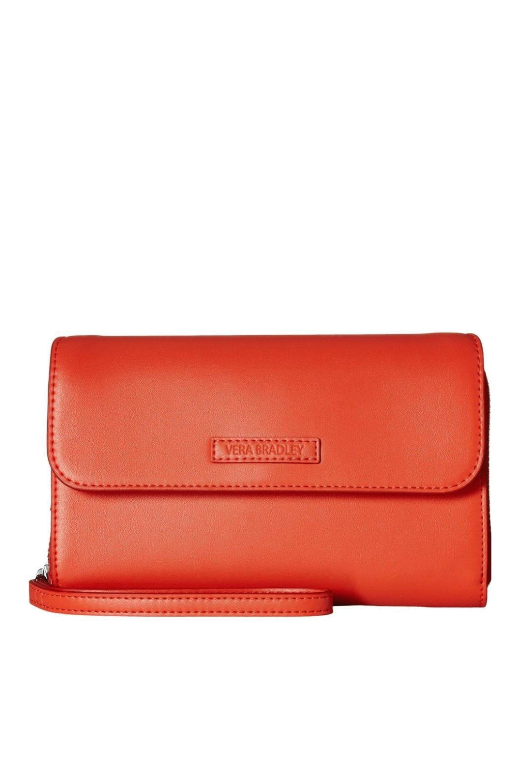 Here is the Vera Bradley Vegan Leather Ultimate Wristlet in the color Orange. Flaunt an easy style that's convenient and cute. Push-lock closure. Wristlet strap. Signature logo ingraved detail in front. Lined interior. Inside the front flap closure is a compartment with 10 card slip pockets, two ID windows, and a bill pocket. Zip compartment has a divided interior with one bill pocket, two pleated compartments and six card slip pockets. Fits a phone up to 6.5". Click on "Mimi's Gift Gallery" on this page to find other Orange bags and accessories. Dimensions are 7 ¼" wide x 4 ¾" high x 1 ½" deep with a 6" vegan leather wrist strap.