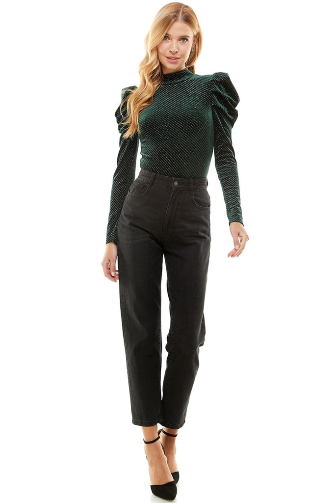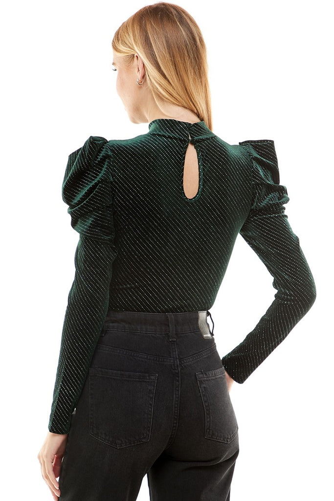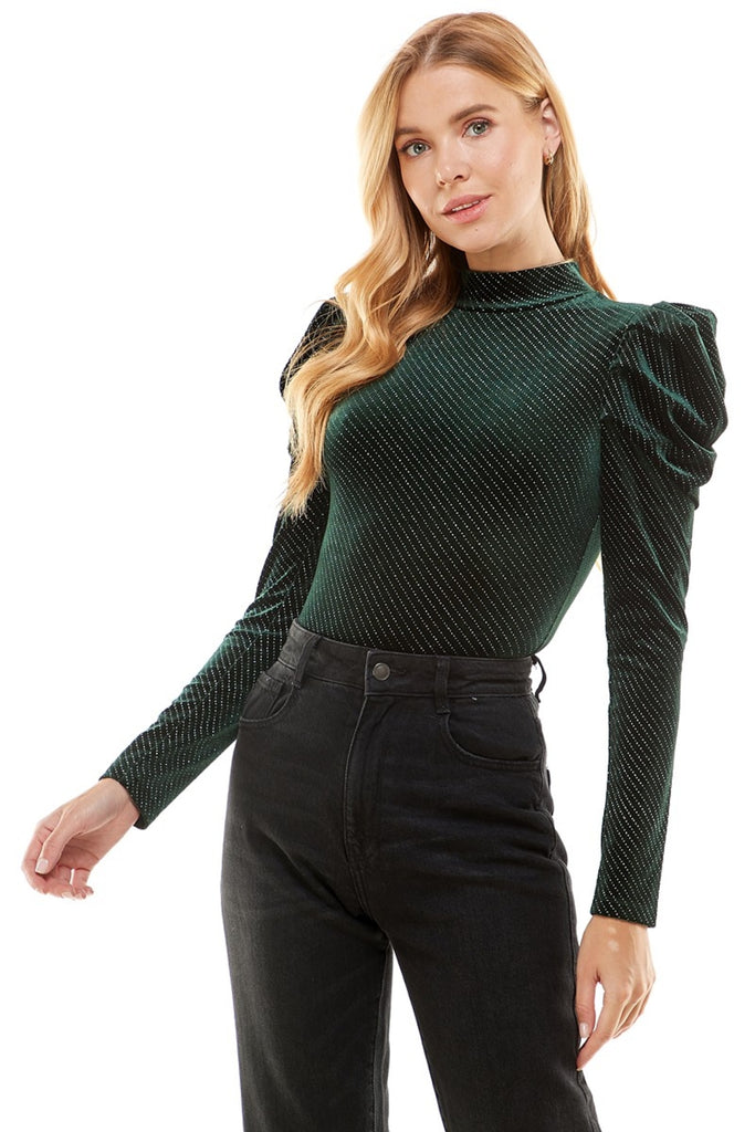 A velvet knit bodysuit featuring an allover silver dot design, mock neck with back cutout loop-button closure, long puff sleeves, a snap-button closure and a thong shaped rear to avoid panty lines!