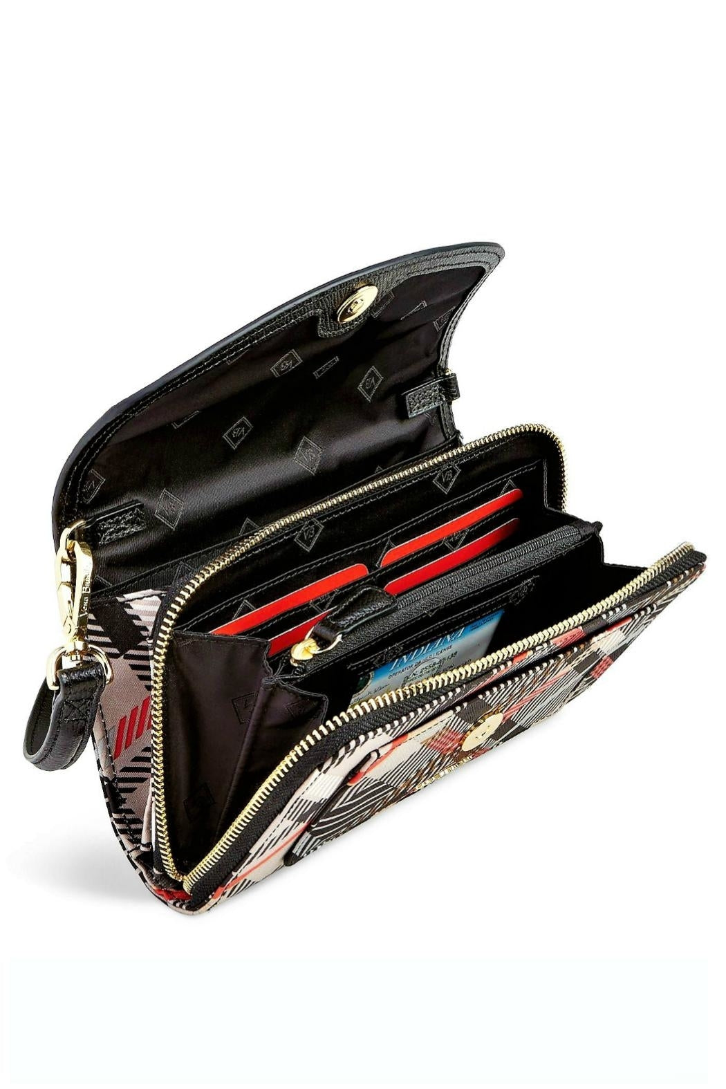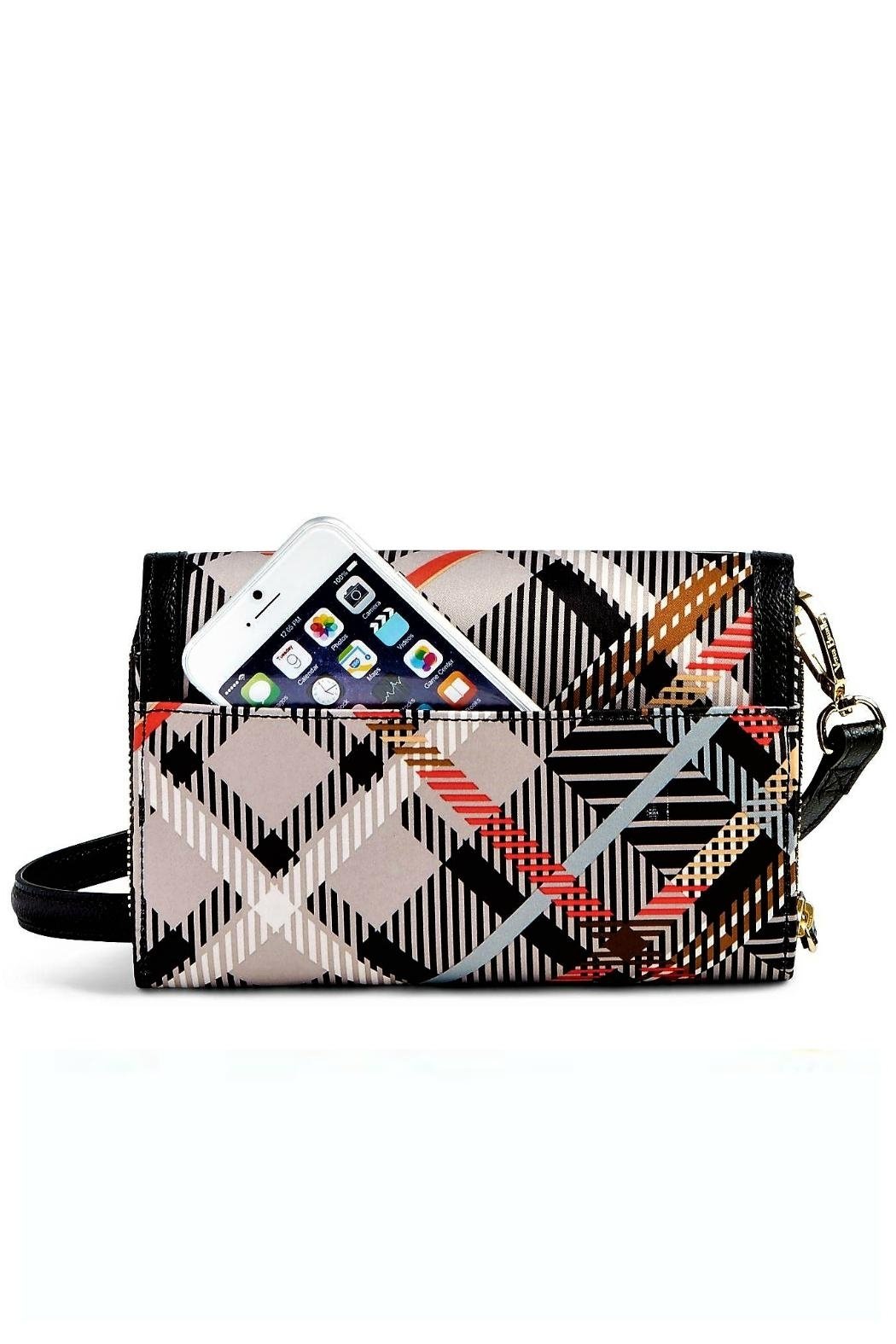 Let us introduce you to the Ultimate Crossbody in the Sofia Plaid pattern which is spacious enough to hold your iPhone, your ID, cards, cash, and a note from your mom telling you how proud she has always been of you, but still small enough to be unobtrusive at a three-day music festival. Features genuine leather trim and strap, and classy gold-tone hardware, exterior slip pocket perfect for your phone, flap fastens with a magnetic snap and has a slip pocket under the flap, zip compartment contains a pleated pocket, two bill pockets, 12 card slip pockets, a zip coin pocket and an ID window. The gusseted compartment contains two bill pockets and six card slip pockets. Find other bags and accessories in the Sofia Plaid pattern on the "Mimi's Gift Gallery" boutique page.