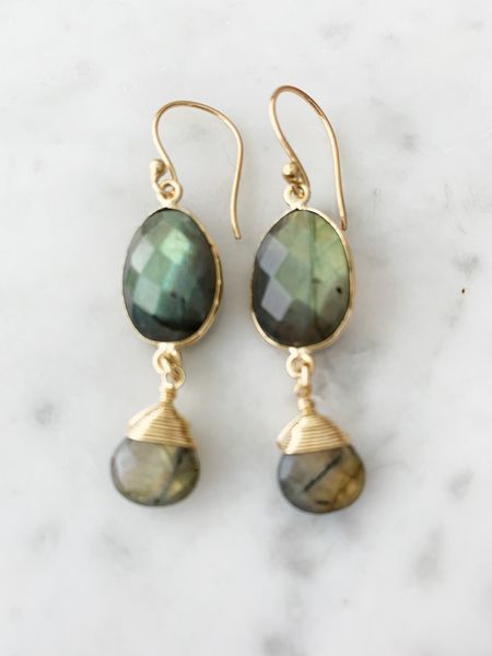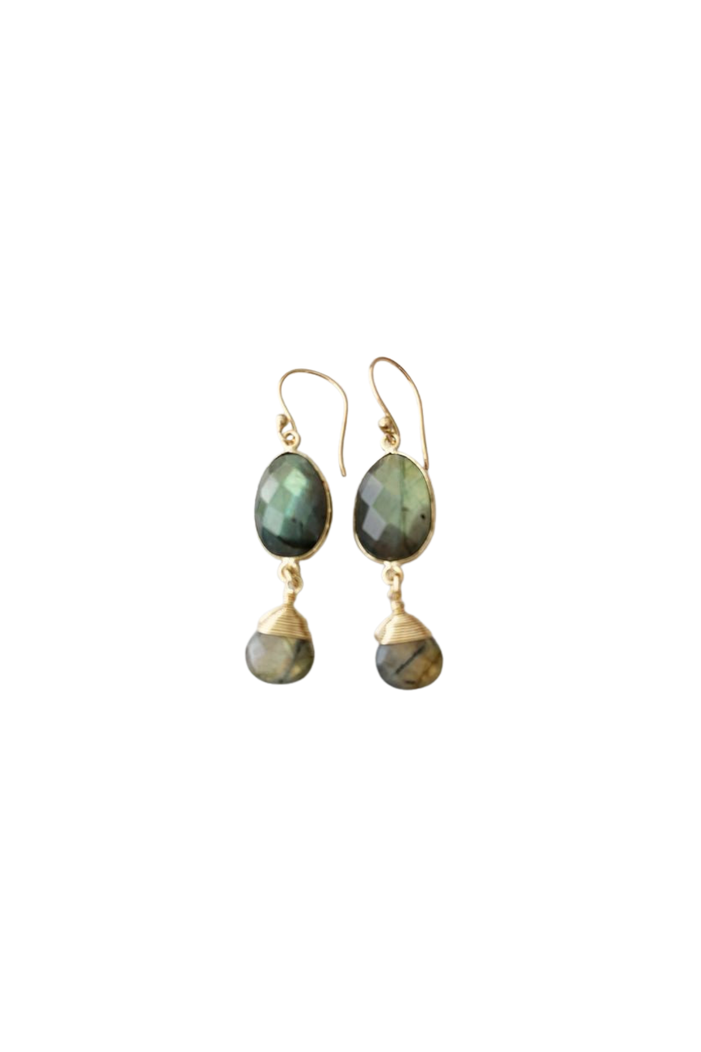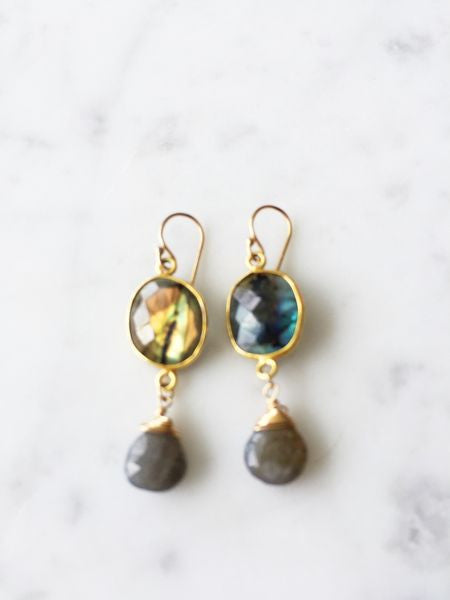Gold dangle earring with a large faceted bezel set labradorite stone with a matching small faceted teardrop labradorite stone hand-wrapped with 14k gold fill wire.