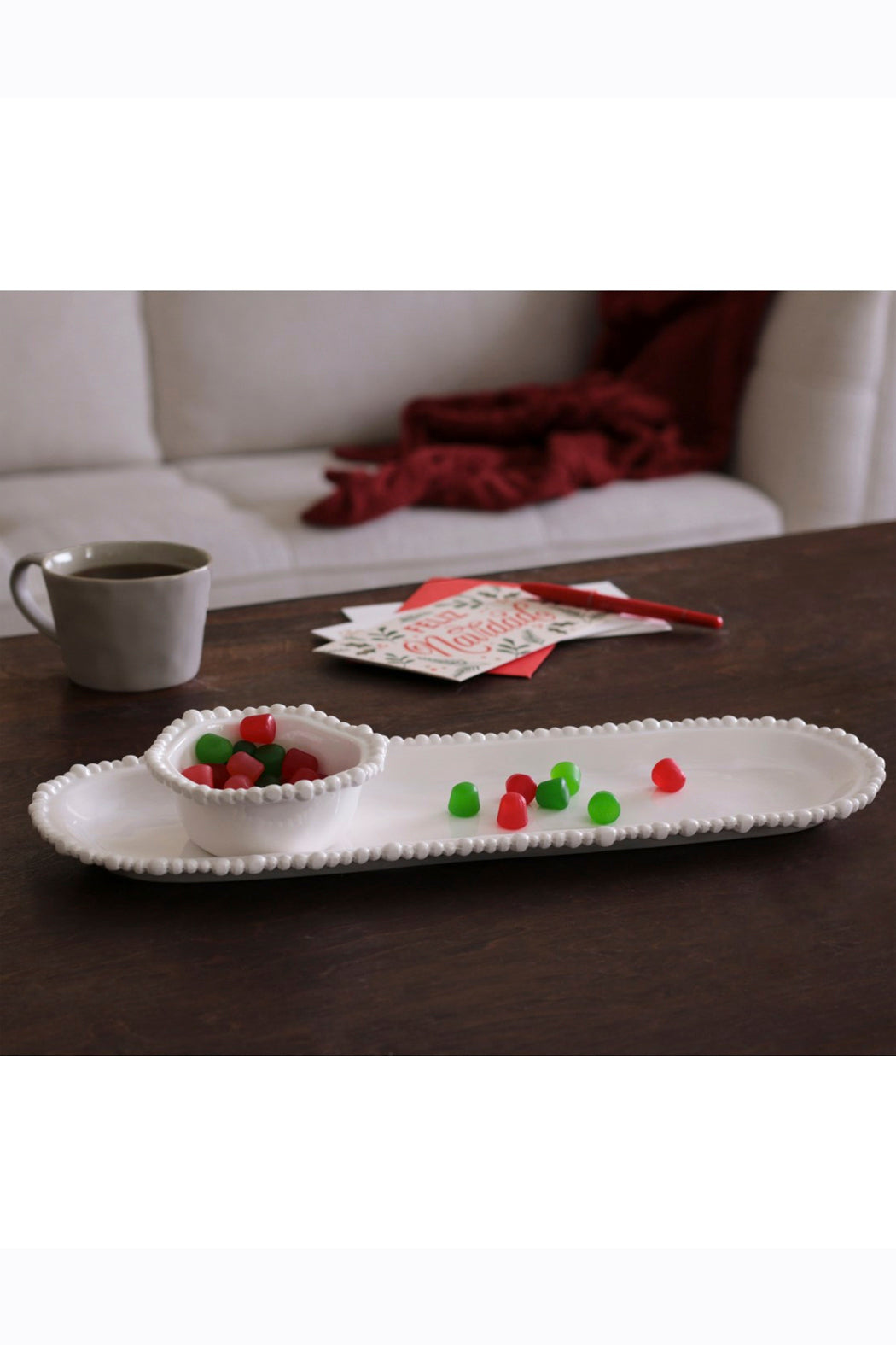 With a charming pearl rim and a radiant surface, the generous platter may be paired with other white pieces for a coordinated serving set, or combined with items in other color ways in the Alegria Collection for a vibrant table setting. It looks great when sharing a table with items from Beatriz Ball’s signature metal line, too. Great for serving bread, cheeses, sushi or charctuerie, this generous platter has the luster, heft and look of a ceramic piece.