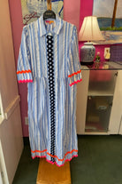 A breezy, collared shirt dress cut in blue-and-white seersucker with vivid neon trim for a playful pop. The Vilagallo Striped Seersucker Dress with Bright Trim has a relaxed, maxi silhouette and three-quarter sleeves that read effortless and polished. Wear it on vacation or for casual weekend style when you want an easy, preppy-meets-trendy look.