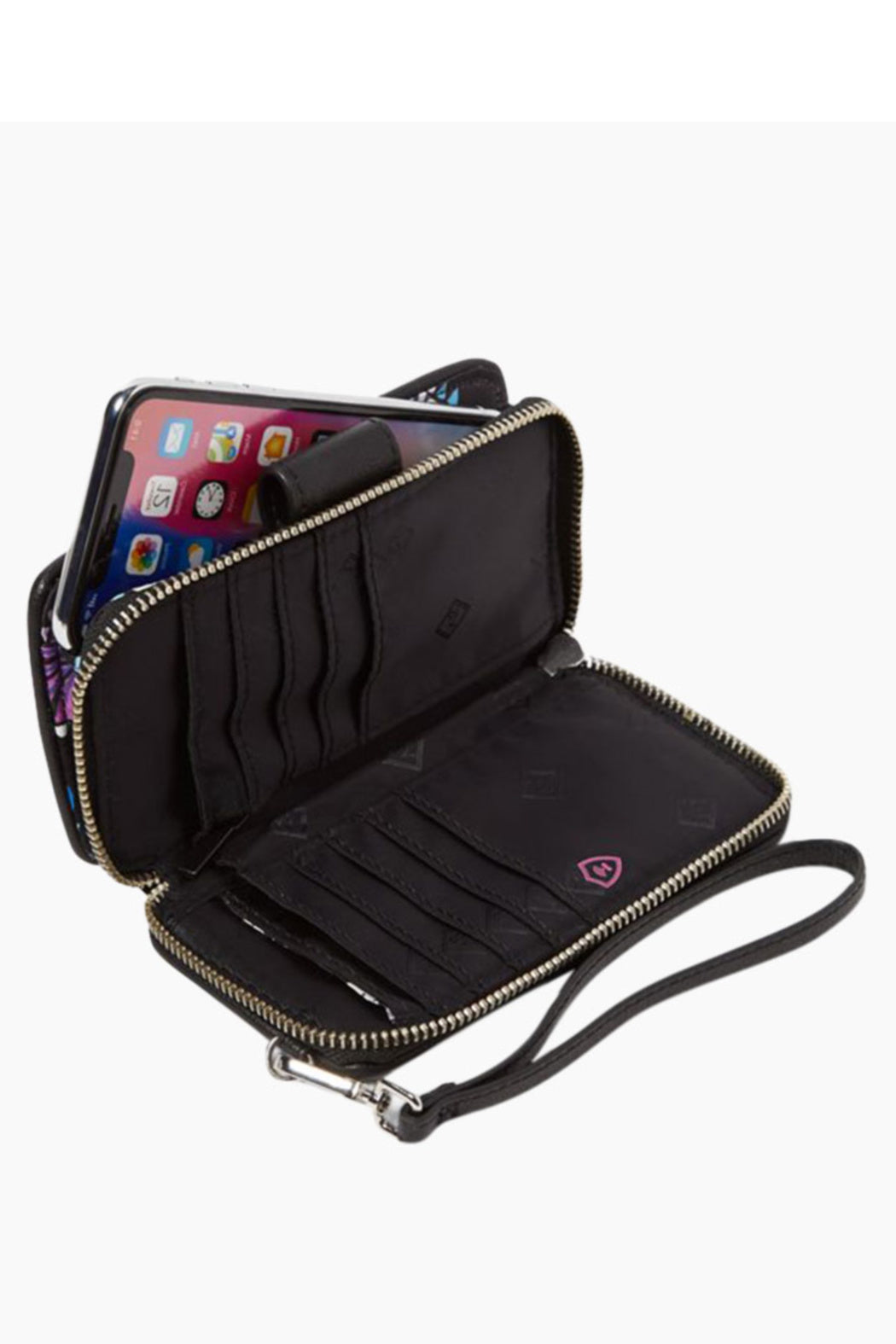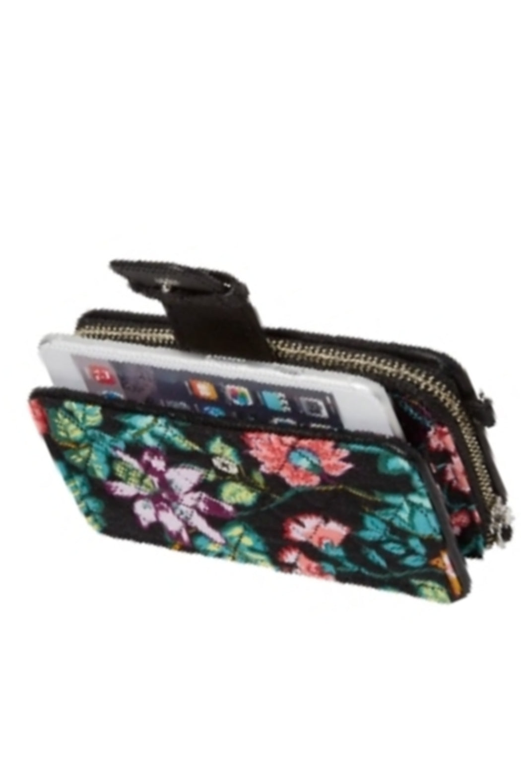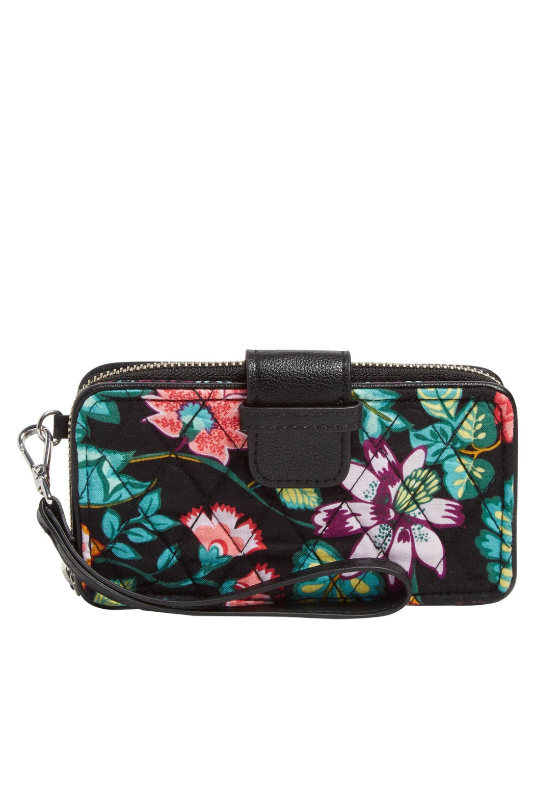 Here is the Vera Bradley RFID Smartphone Wristlet in the Vines Floral pattern. Give your look a dash of chic with this fun wristlet. Made of quilted cotton with vegan leather trim and a poly satin signature lining. RFID protection for all your credit and debit cards. Zipper closure. Detachable wristlet strap. Exterior back ID window. Slip phone pocket fits up to 6" cell phone has pin snap closure. Eight interior credit card slots, zip coin pocket, slip pocket, and a bill pocket with zip closure. Silver tone hardware. Pattern placement will vary. Click on "Mimi's Gift Gallery" to find other bags and accessories in the Vines Floral pattern.