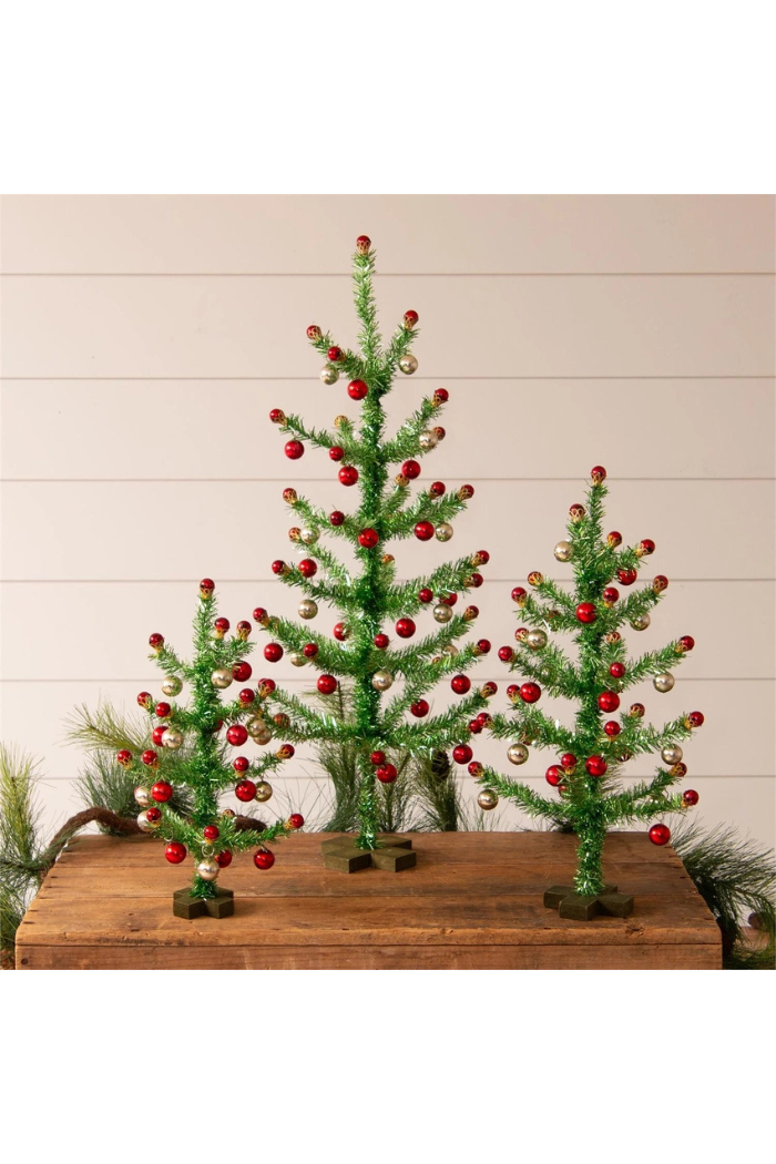 Bring a touch of vintage charm to your holiday decor with these stunning Christmas trees and their dazzling ornaments. Crafted from durable plastic, each tree stands at 25 inches tall and measures 11 inches wide. Add a festive and timeless touch to your home with these eye-catching decorations!