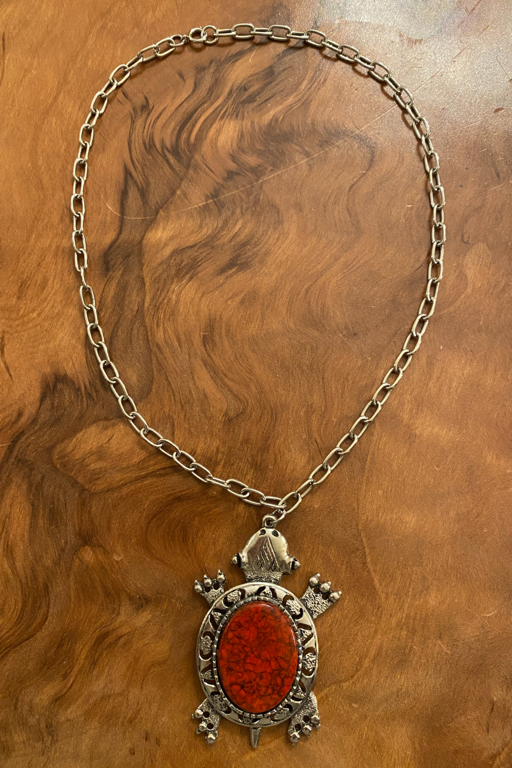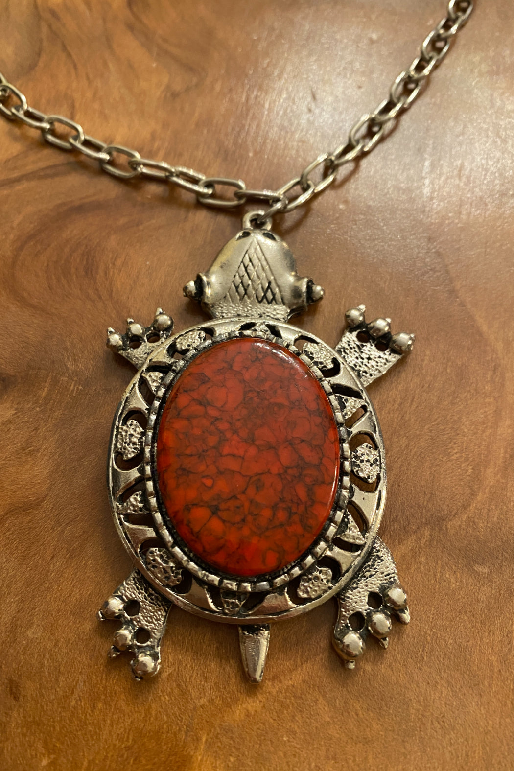 Vintage Silvertone Agate Turtle Necklace. 23 inches long.