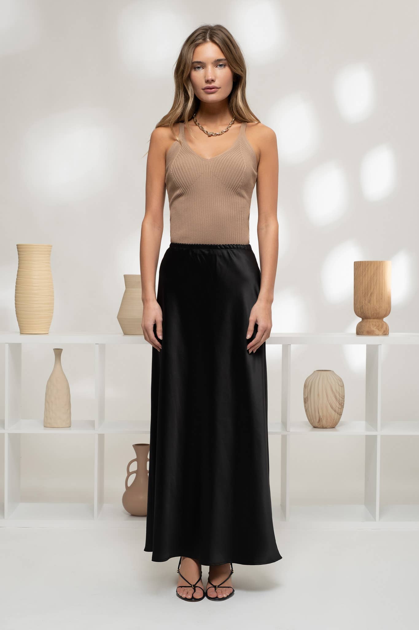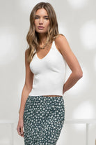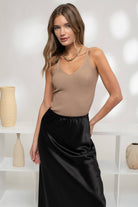 Indulge in the luxurious and versatile VNeck Knit Cami in Tan & Ivory! With sizes ranging from Small to Large, this ribbed, fitted sweater tank top is perfect for any occasion. Its soft and breathable material, made from 70% viscose and 30% polyester, guarantees comfort and style. Don't miss out on this must-have addition to your wardrobe!