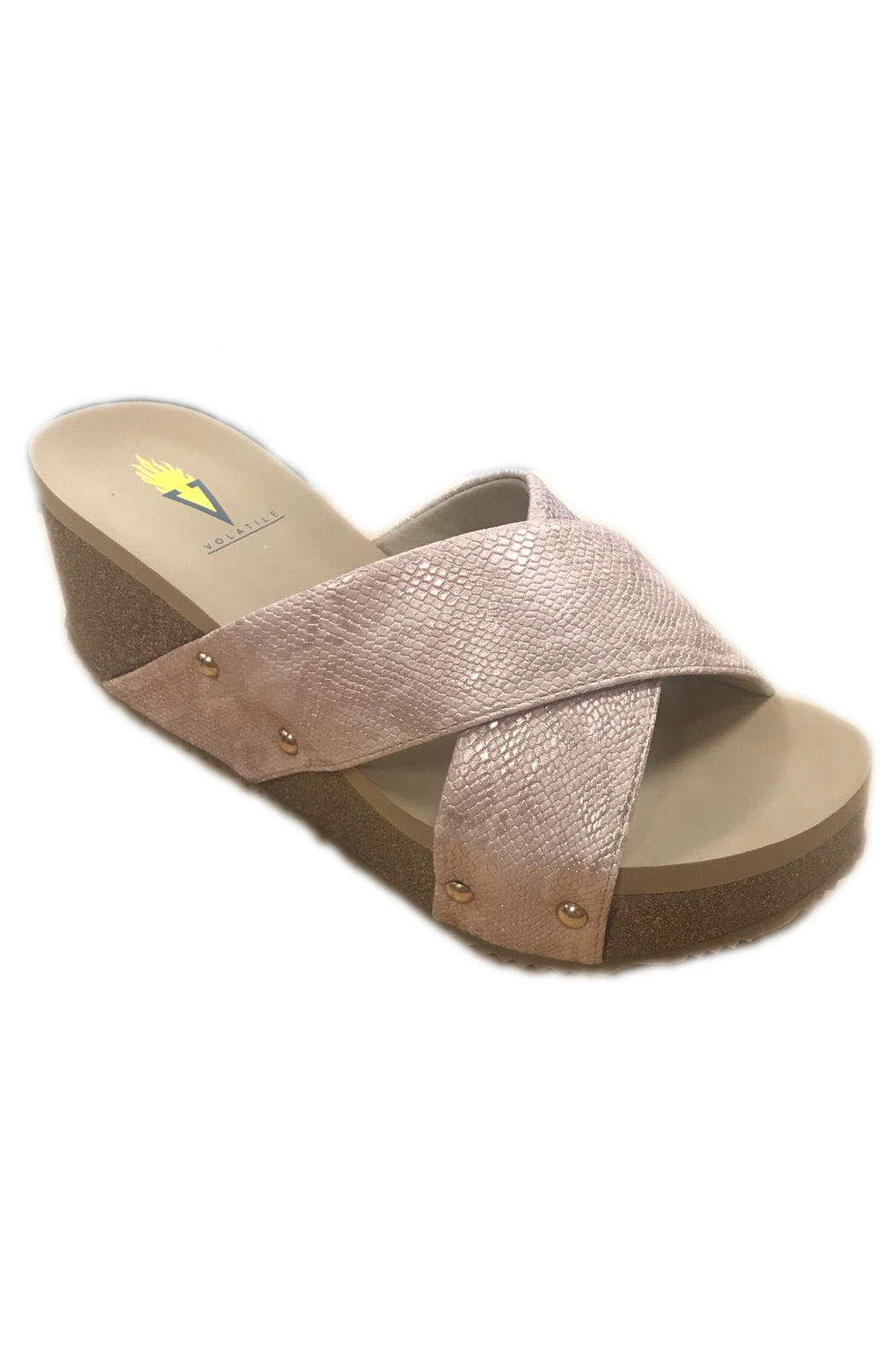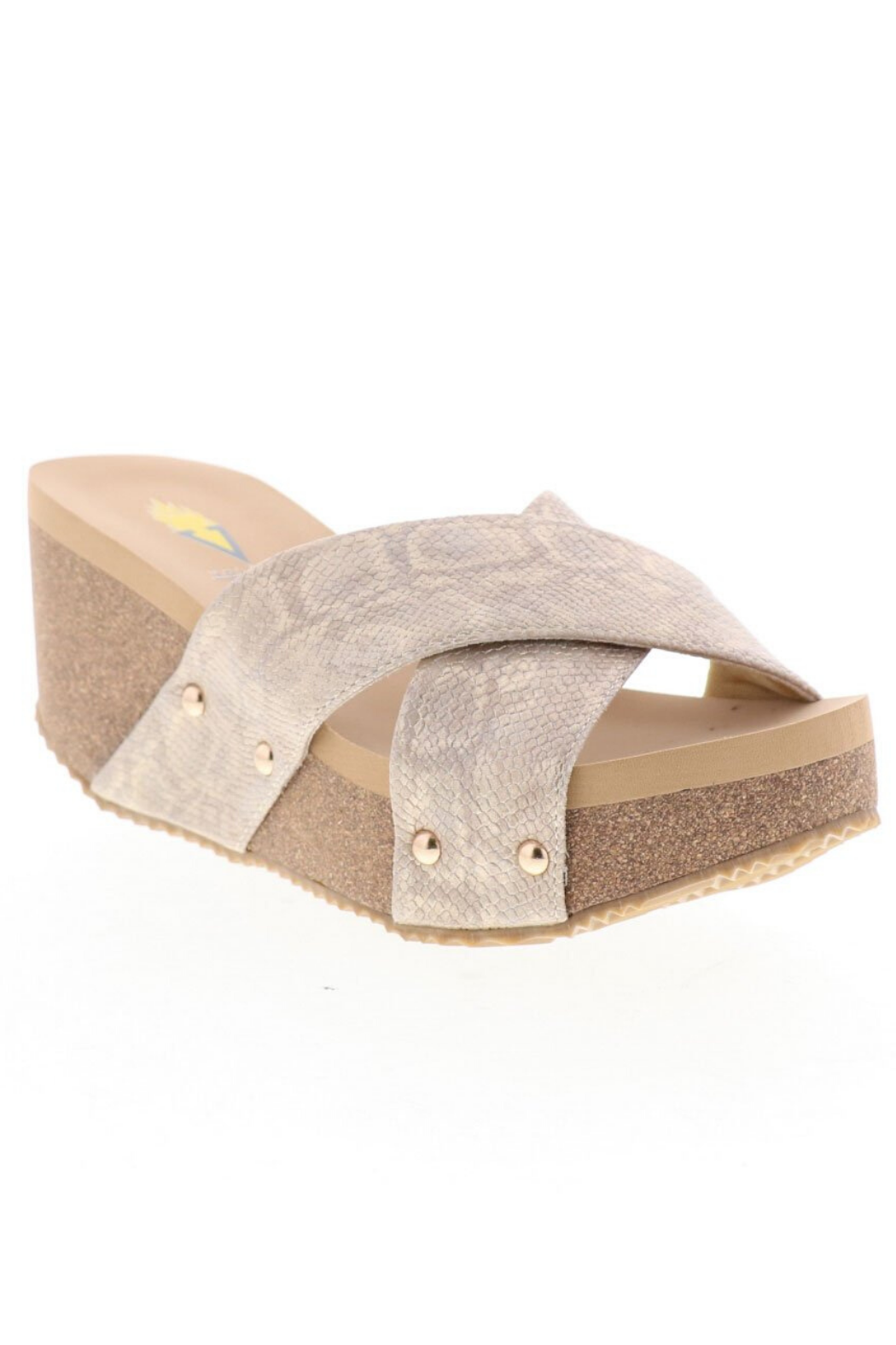 Snake print criss cross wedge features a 1.5 in. platform and 2.5 in. wedge.