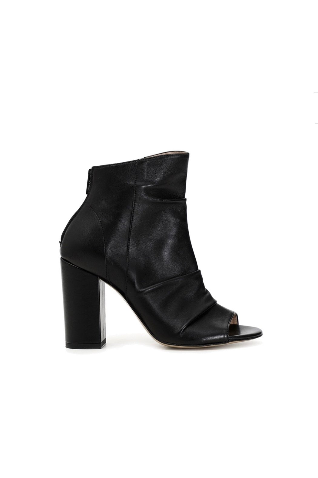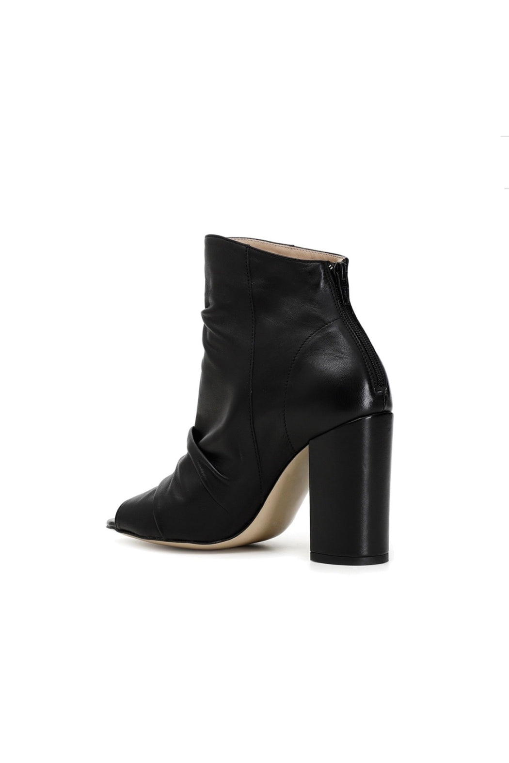 Soft nappa open toe ankle boots. Leather-coated heel