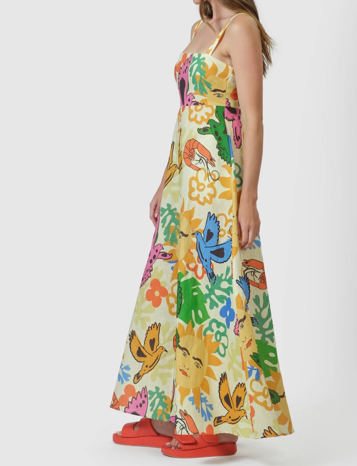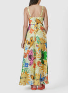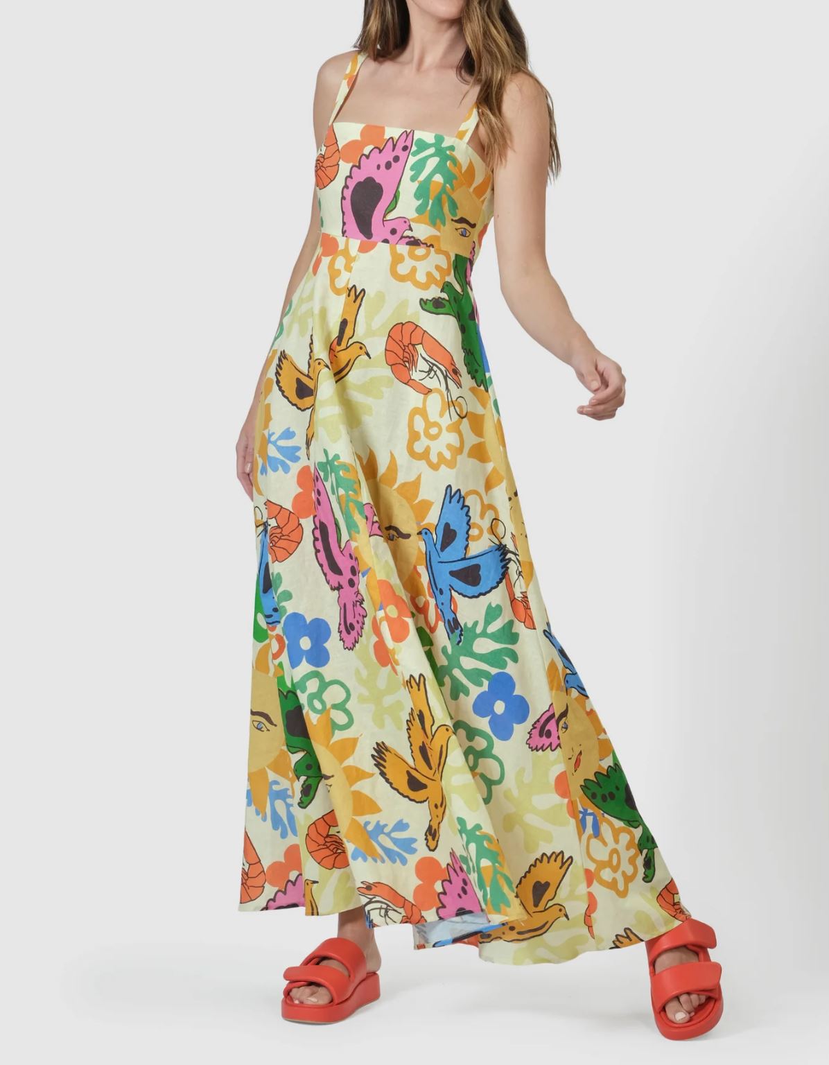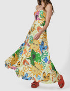 The Milan dress in Soiree is a stunning flowy maxi style featuring adjustable thin straps, practical side pockets, a convenient back zip closure, and crafted from light, breathable fabric, making it the ideal choice for warm weather occasions.