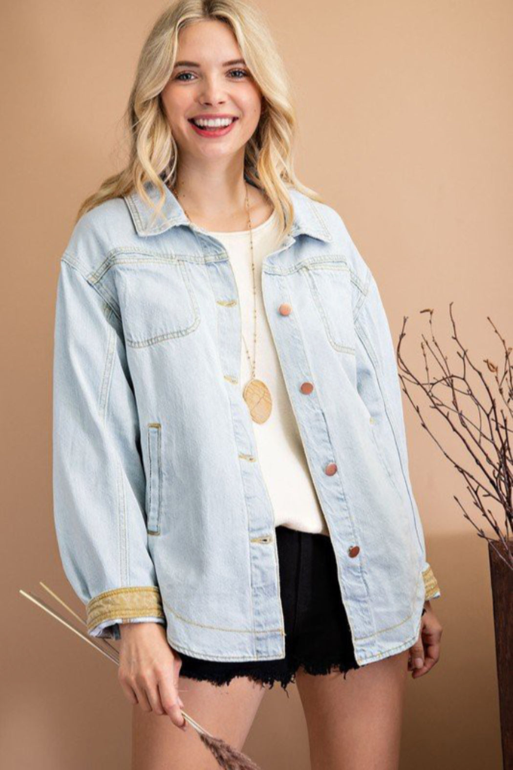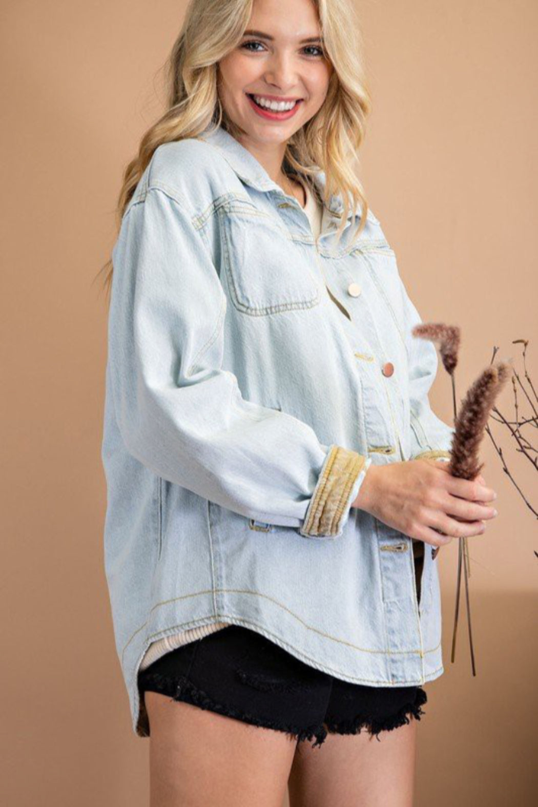 SOLID WASHED DENIM CHEST AND SIDE POCKETED BUTTON DOWN SHIRT / JACKET WITH CONTRASTED BANDANA PRINT DETAILS ON THE CUFF