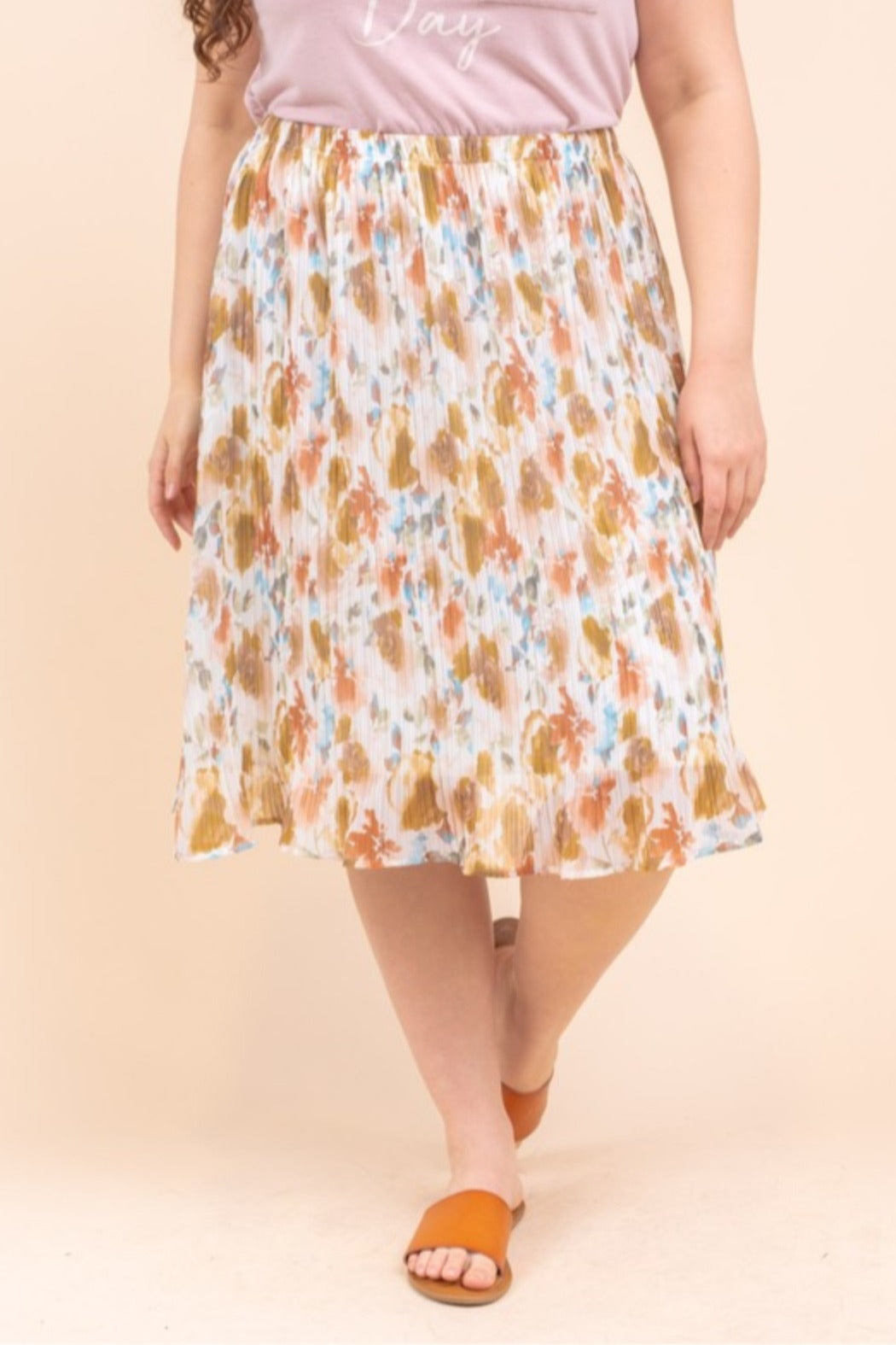 Beautiful mini pleats in a light and airy sheer fabric with a gorgeous floral water color motif. Hits right at the knee on average height. Skirt is fully lined. Models are wearing a 1X. Fit runs true to size.