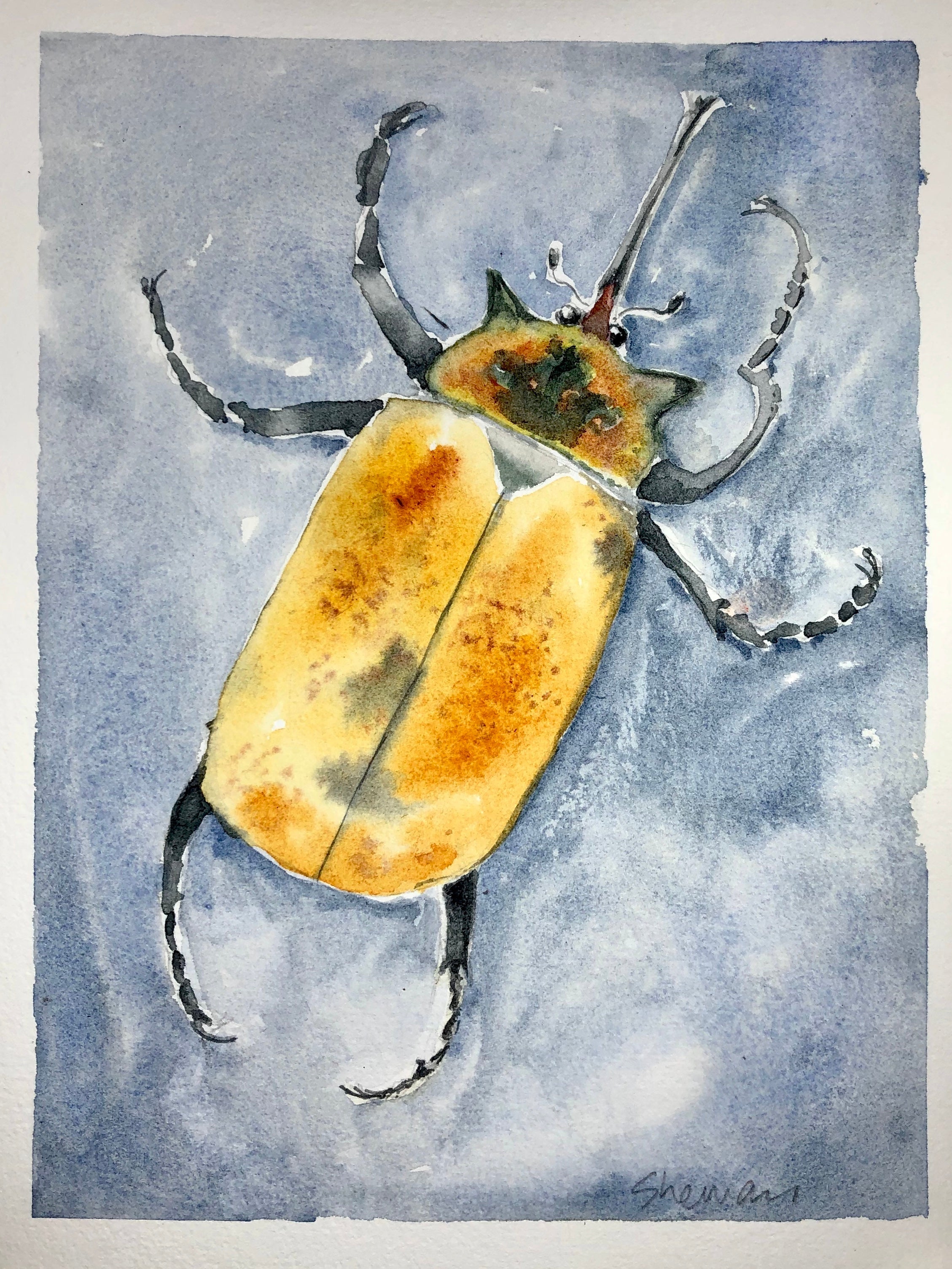 A whimsical and beautiful watercolor painting of a beetle by Kathleen Shewan. The painting is approximately 7.5x5.5" and comes unframed on archival paper.