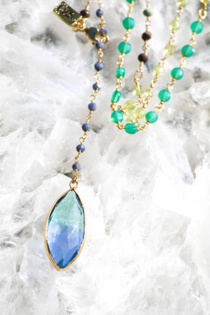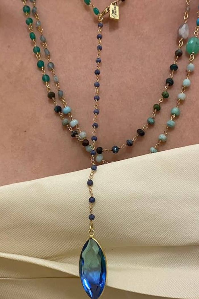 Dainty 14K gold vermeil Y multi gemstone- peridot, green onyx, sapphire and natural turquoise necklace.