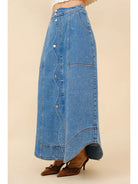 Get into the groove of the denim trend in this maxi skirt featuring a wavy placket and deep front pockets.