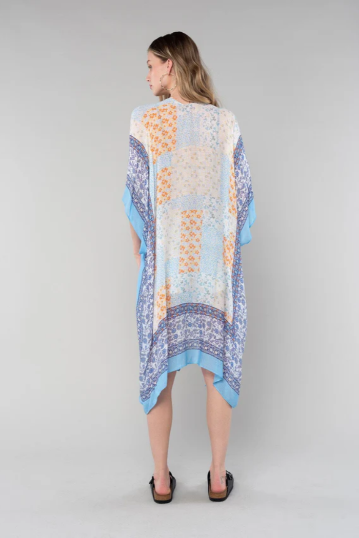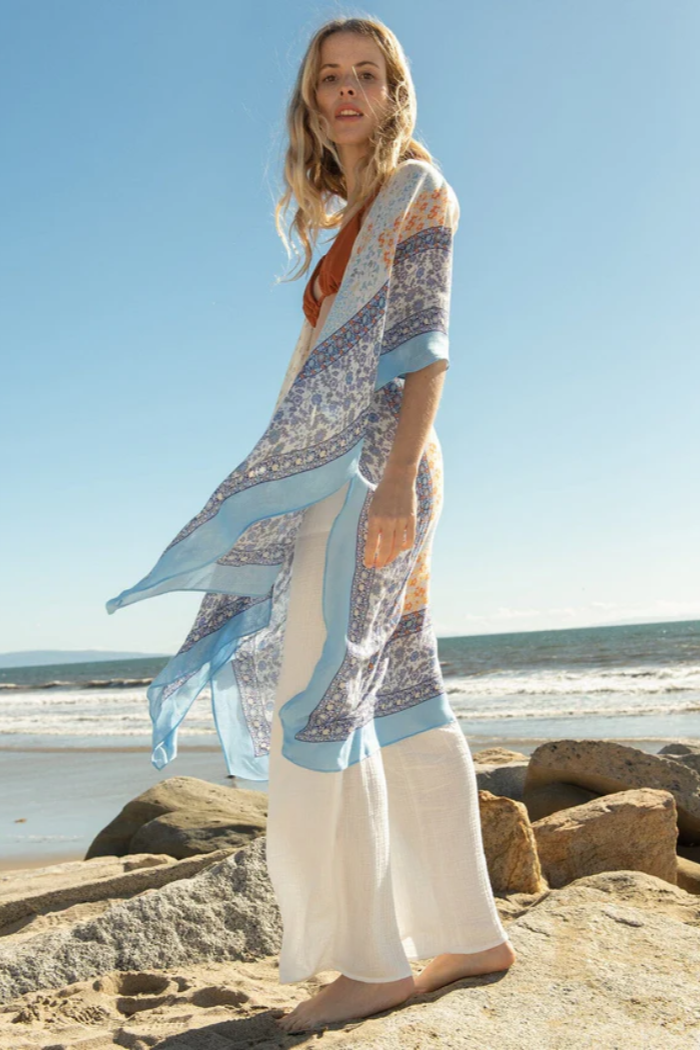A dreamy lightweight kimono in an ivory and blue mixed floral border print.