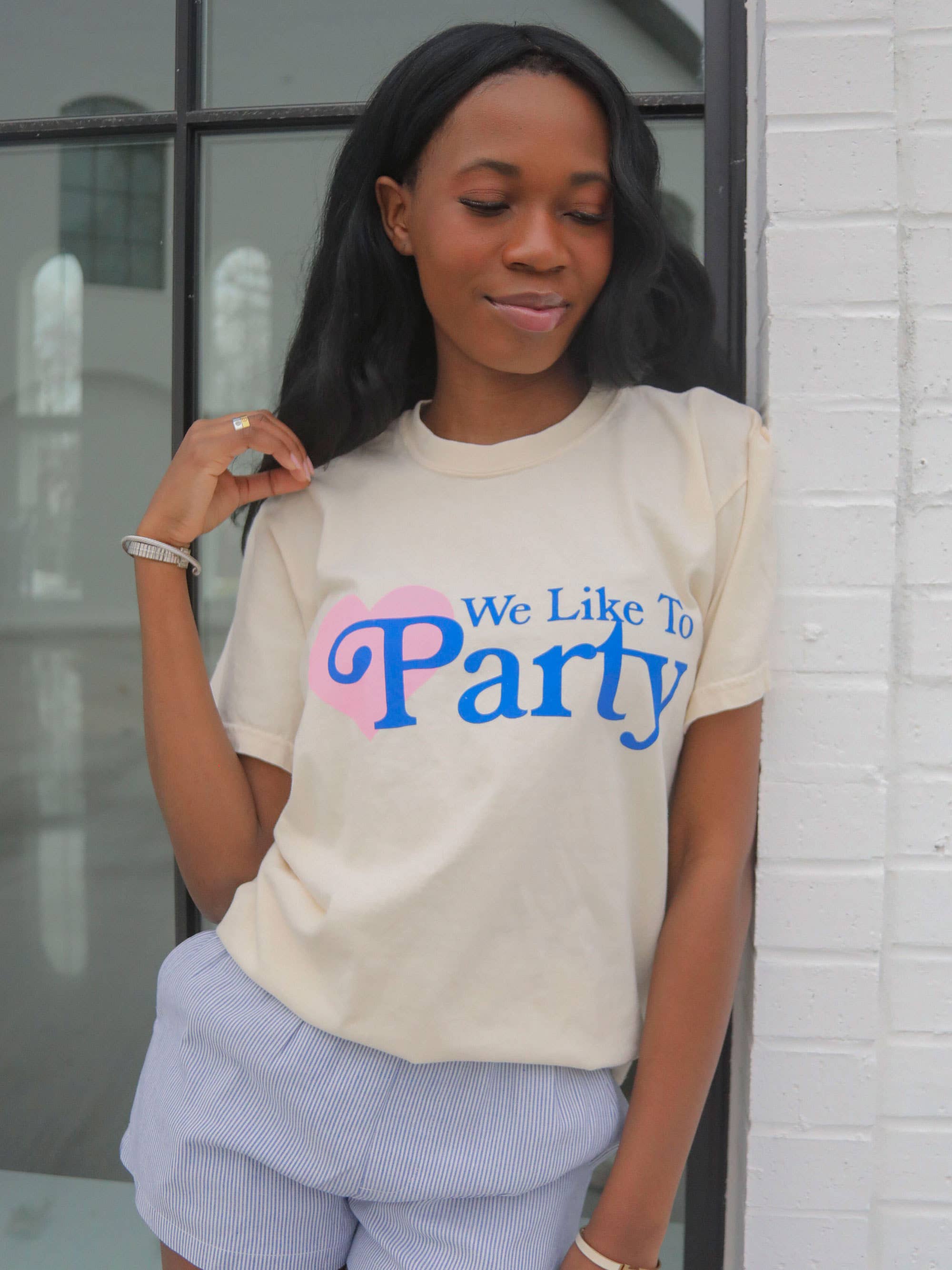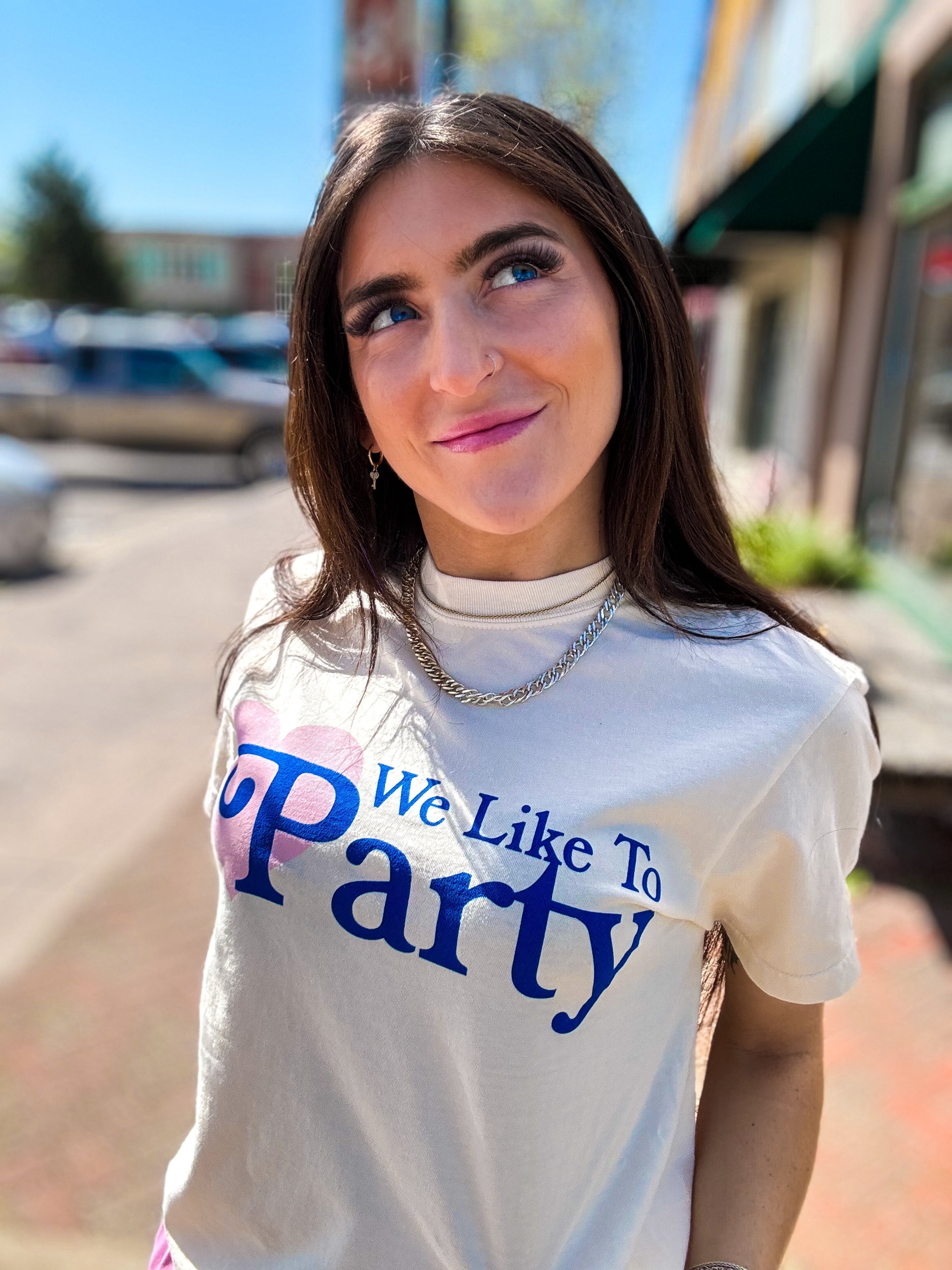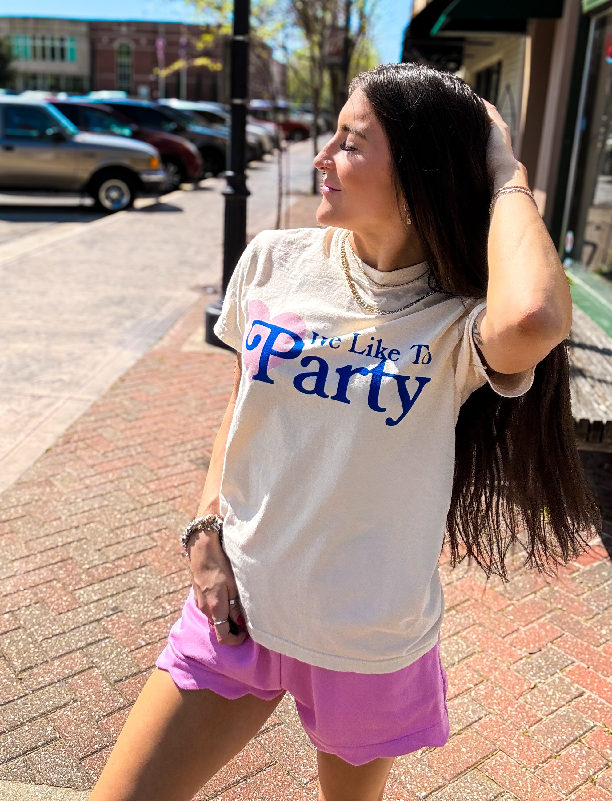 have your girls match you with this tee! who doesn't love a little party with the girl of the main hour?! this natural colored t-shirt features a royal blue font with a bubble gum pink heart that your girls will love!