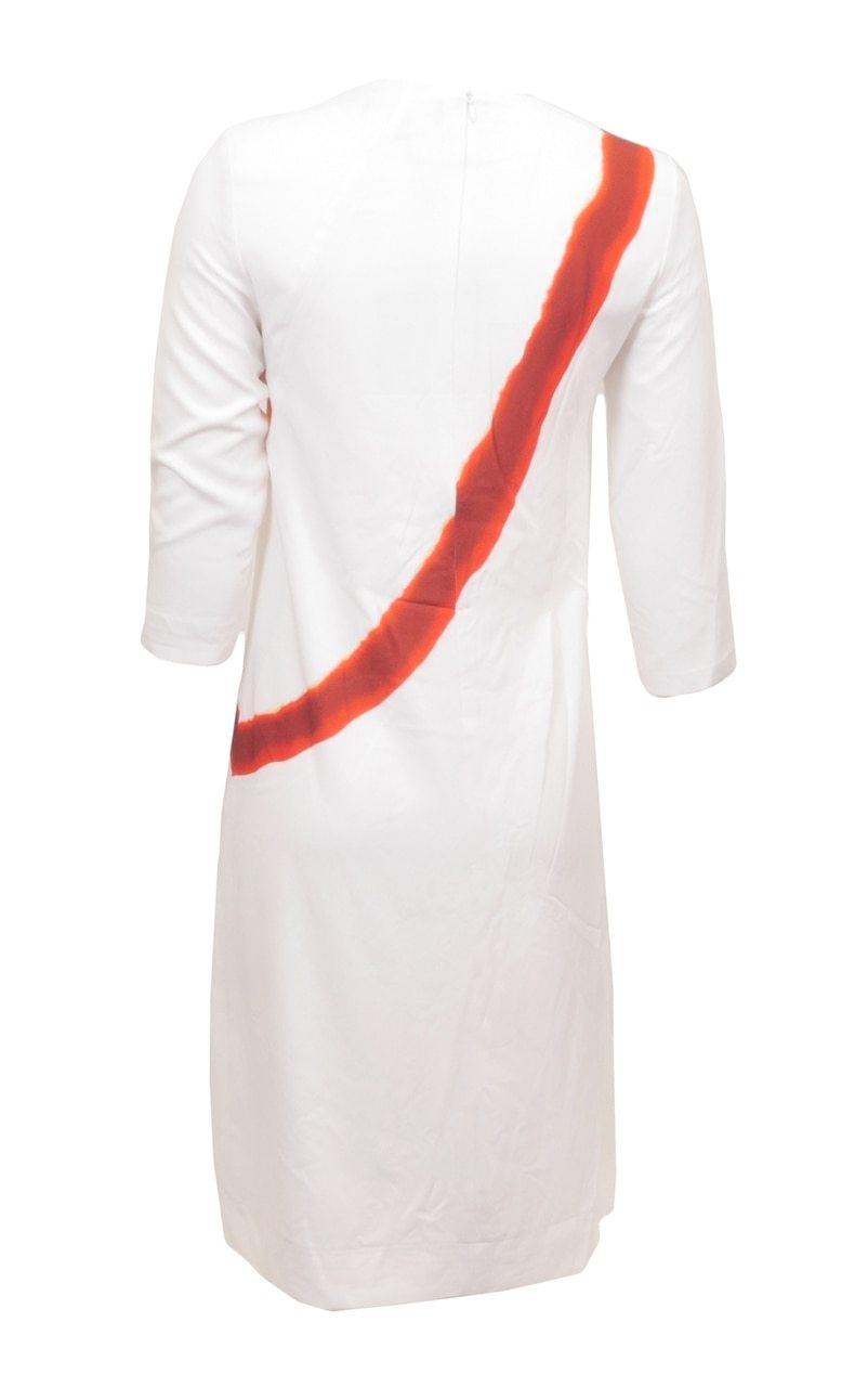 Cream A-line dress with diagonal stripes of reds and orange. Crew neck with three quarter sleeves.