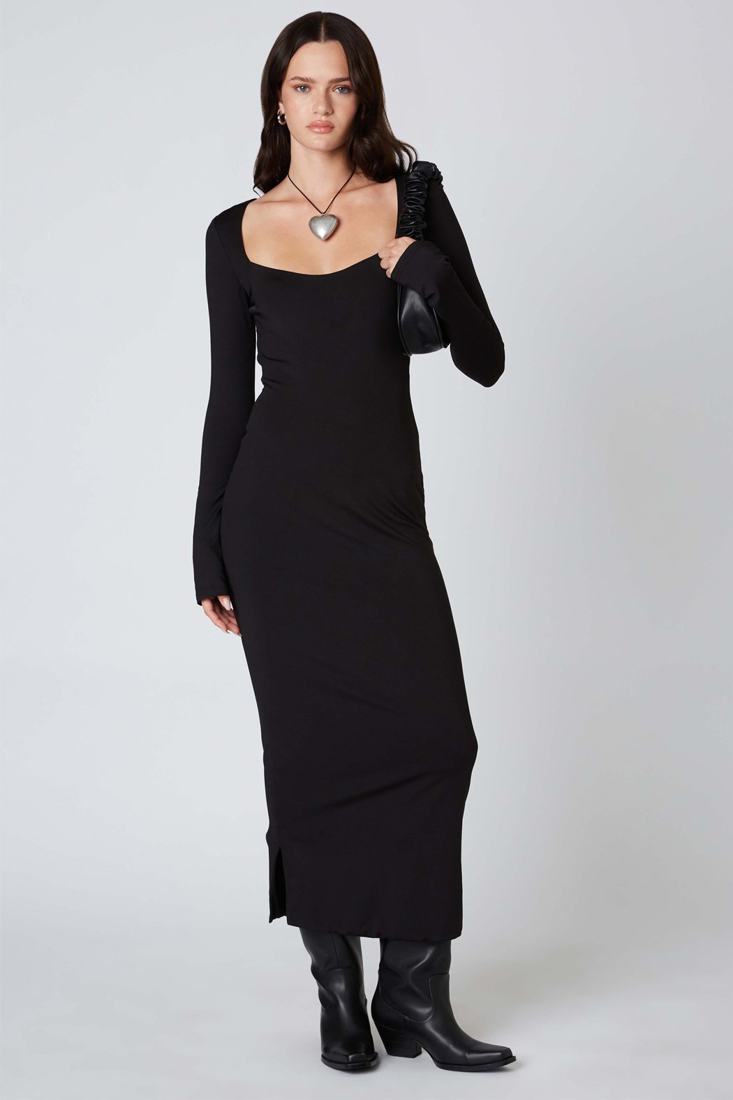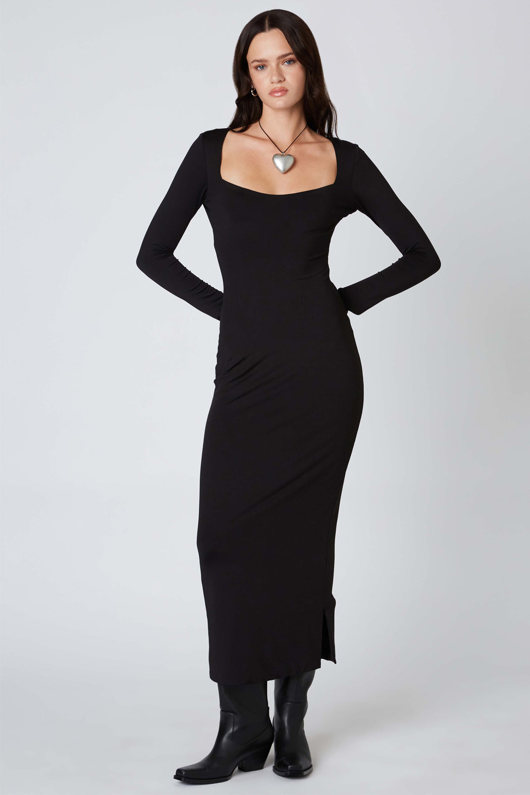 The Wendy dress is figure hugging and classic. Featuring long sleeves, an open back, and square neckline, this dress is perfect for any occasion.