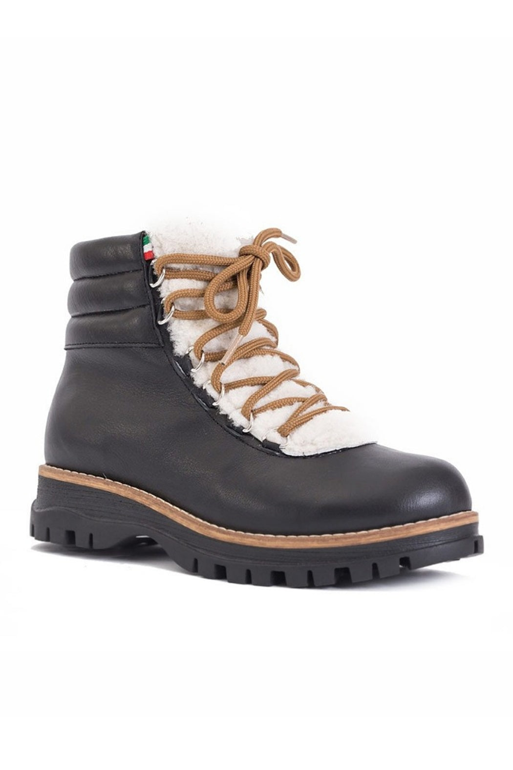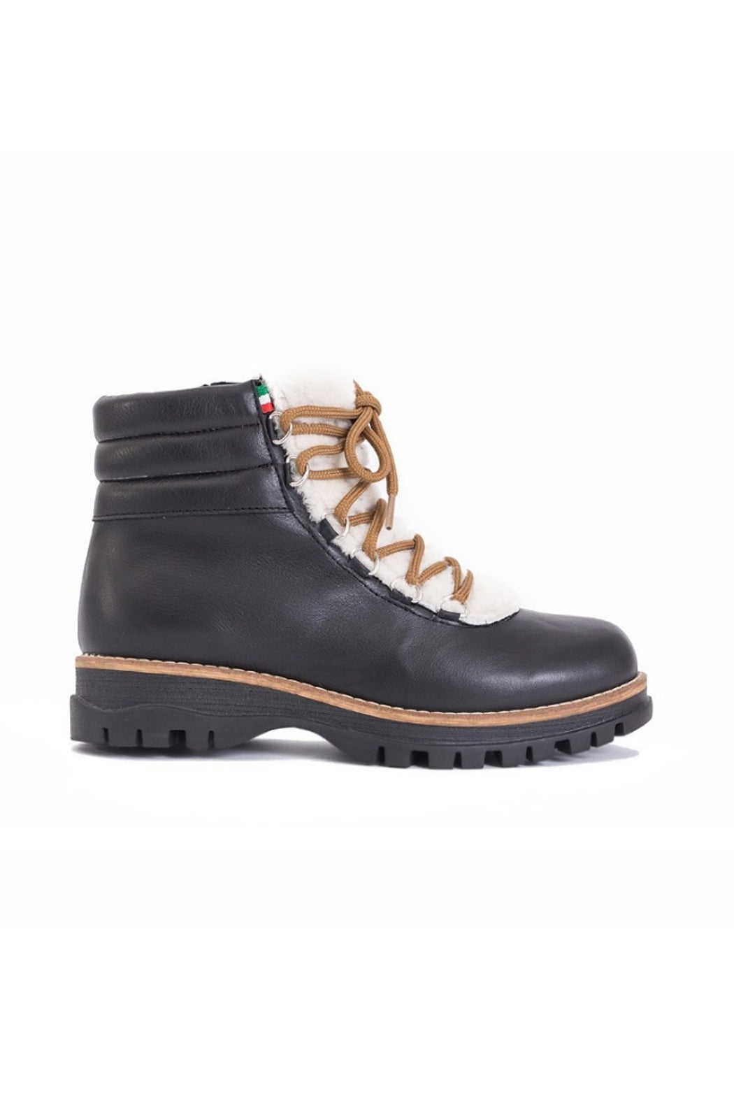 Leather waterproof hiker bootie on a rubber lug sole.