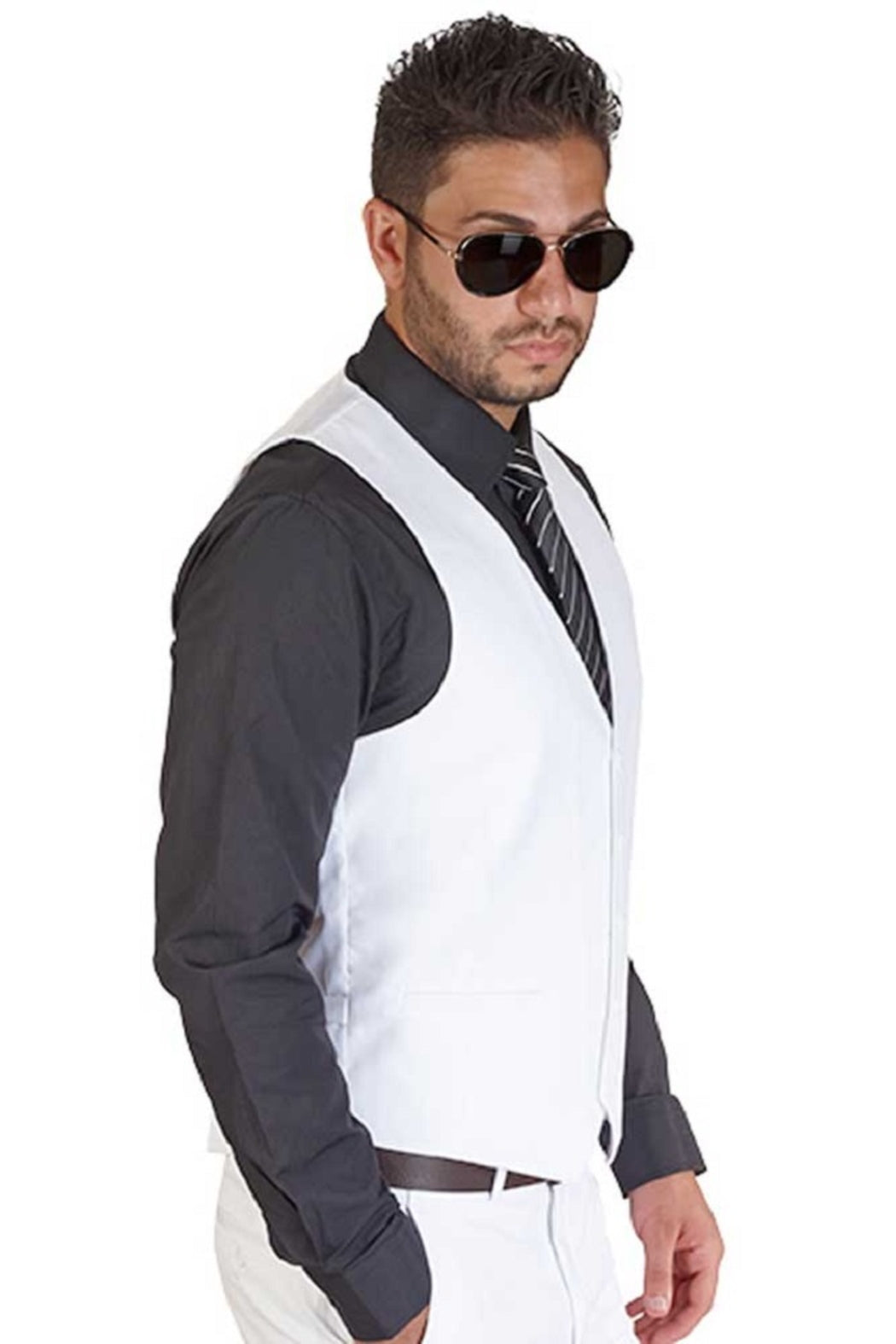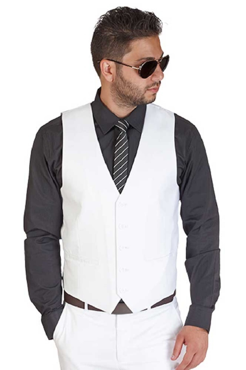 This slim fit vest features 5 buttons, v-neckline style, two real pockets, and an adjustable back strap.
