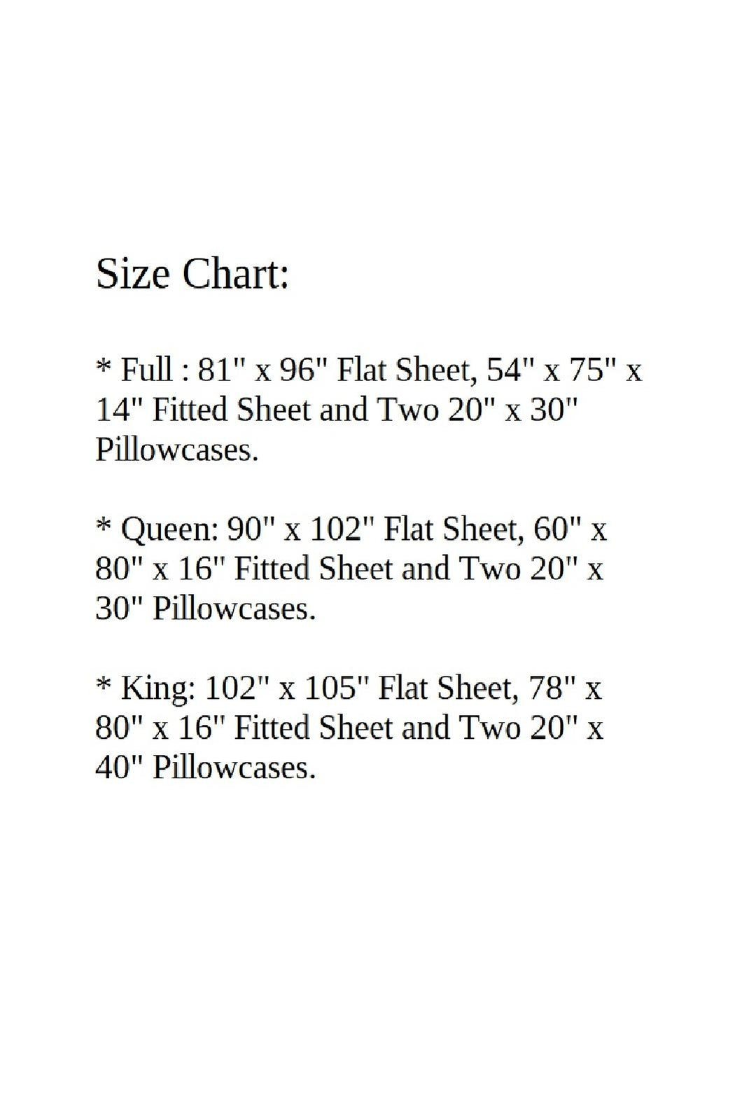 Full : 81" x 96" Flat Sheet, 54" x 75" x 14" Fitted Sheet and Two 20" x 30" Pillowcases.