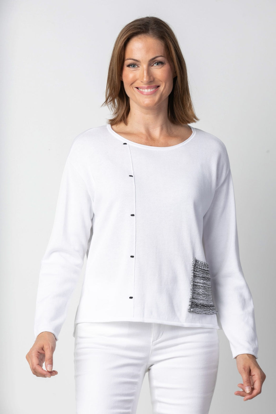 Jump start warmer weather with is fresh cotton knit sweater with rolled hem . Dot embroidery down the front and patch black marled pocket. Split hem. Fun pairing with black and white gingham check skirt or capris.