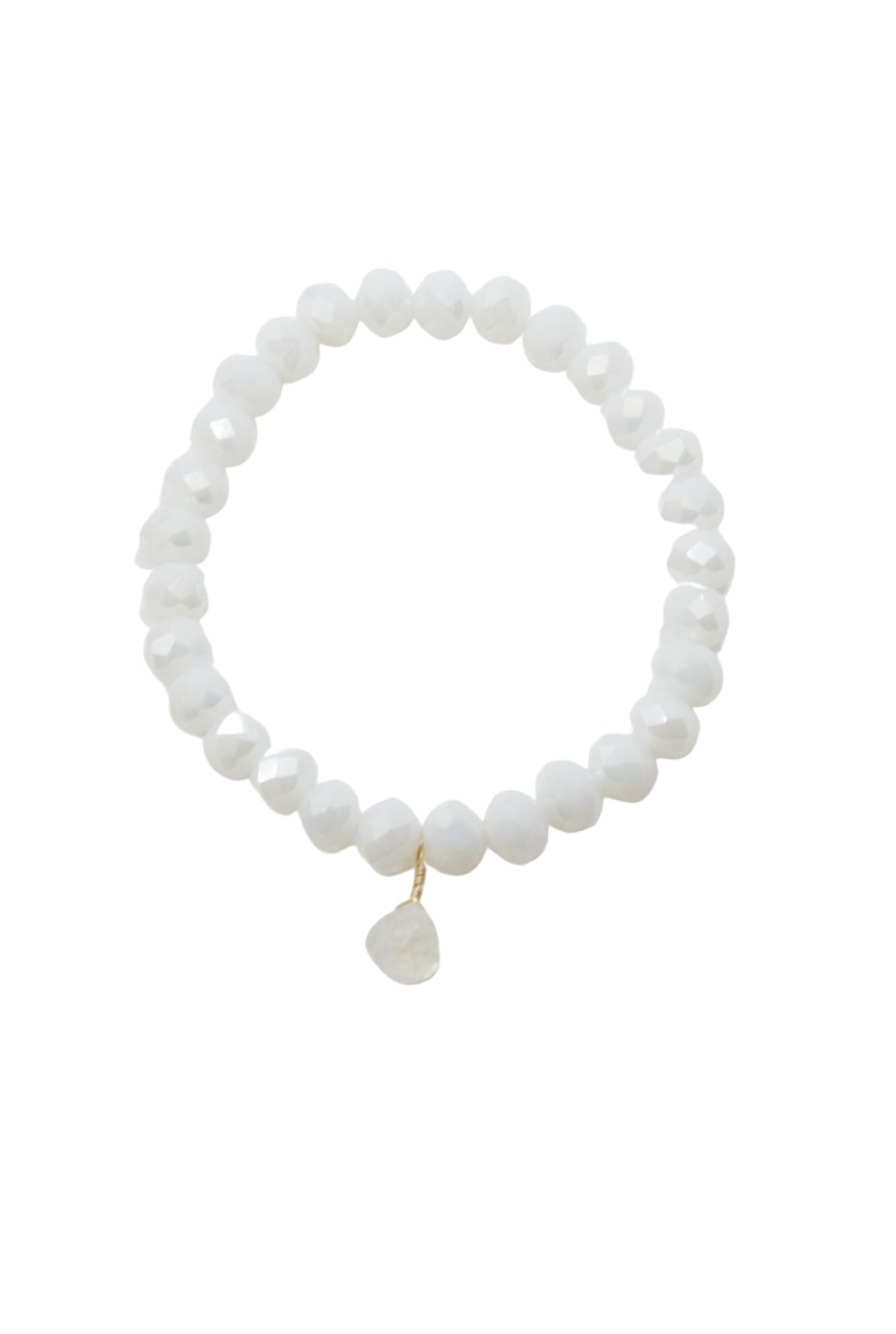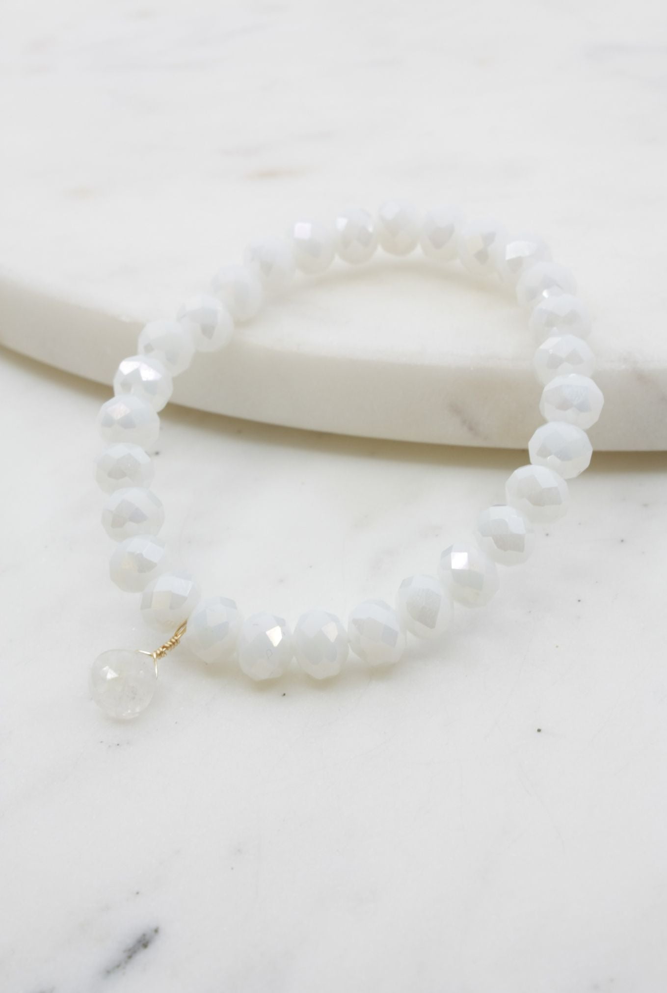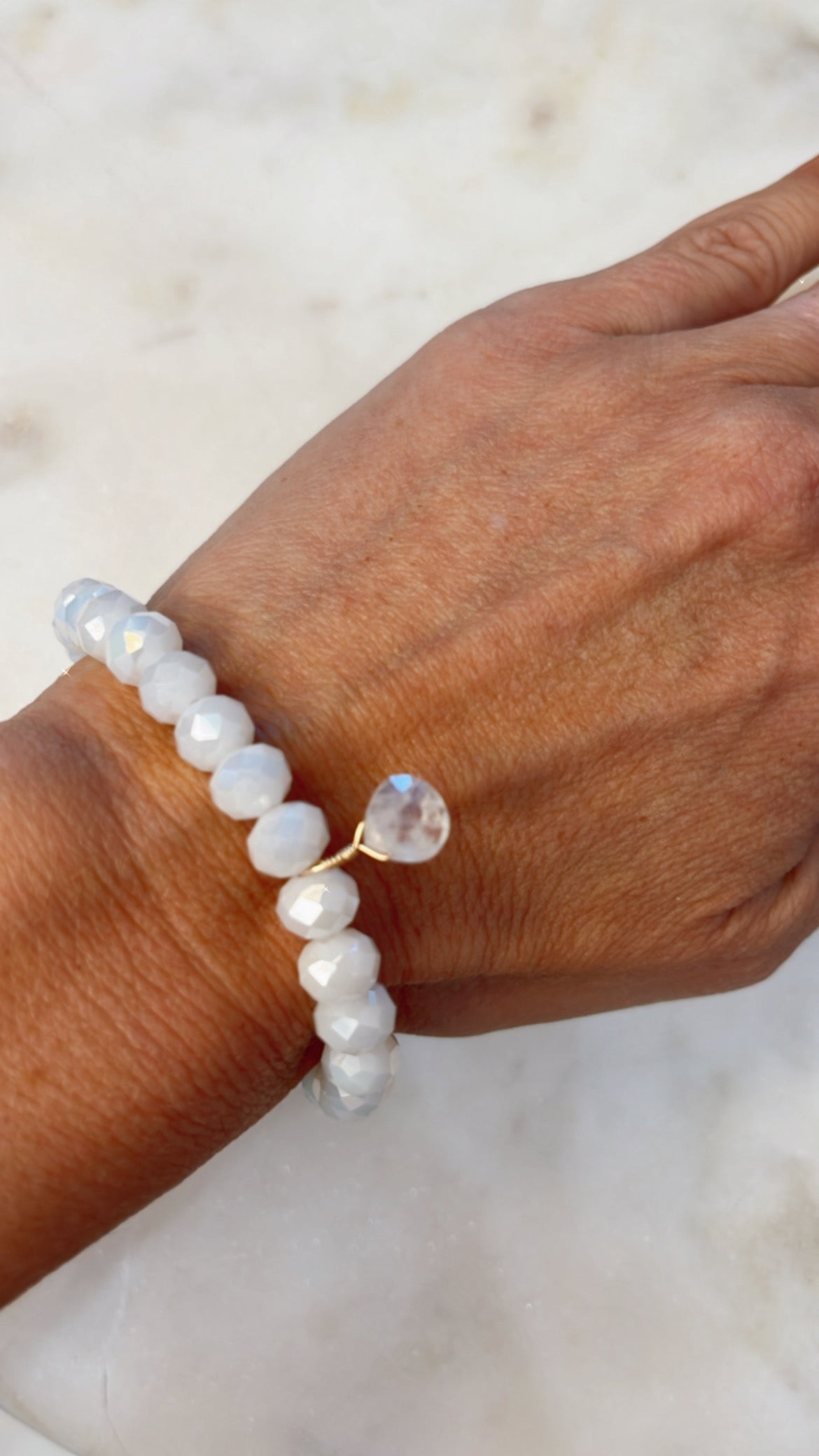 A beautiful irridesent white crystal bracelet with a moonstone hand wrapped in gold