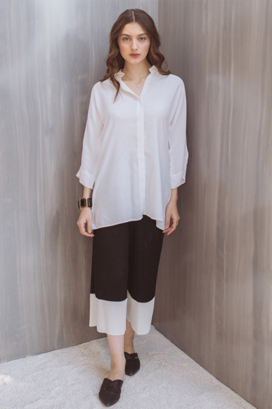 This shirt is made from 100% pure Silk, giving it a luster and flattering drape. This elegant, feminine shirt option is perfect for keeping you cool during a busy workday. it has 3/4 sleeves a no armhole cut for extra comfort and hidden buttons placket.