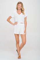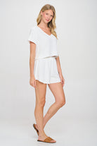 Stay effortlessly stylish and comfortable in this casual two-piece lounge set. Featuring a relaxed V-neck top with short sleeves and breezy elastic waist shorts, this set is perfect for warm-weather days, lounging at home, or casual outings. Designed with a lightweight, breathable fabric, it offers an easy, relaxed fit for all-day wear. Pair it with sandals for a laid-back look or sneakers for an effortless street-style vibe.