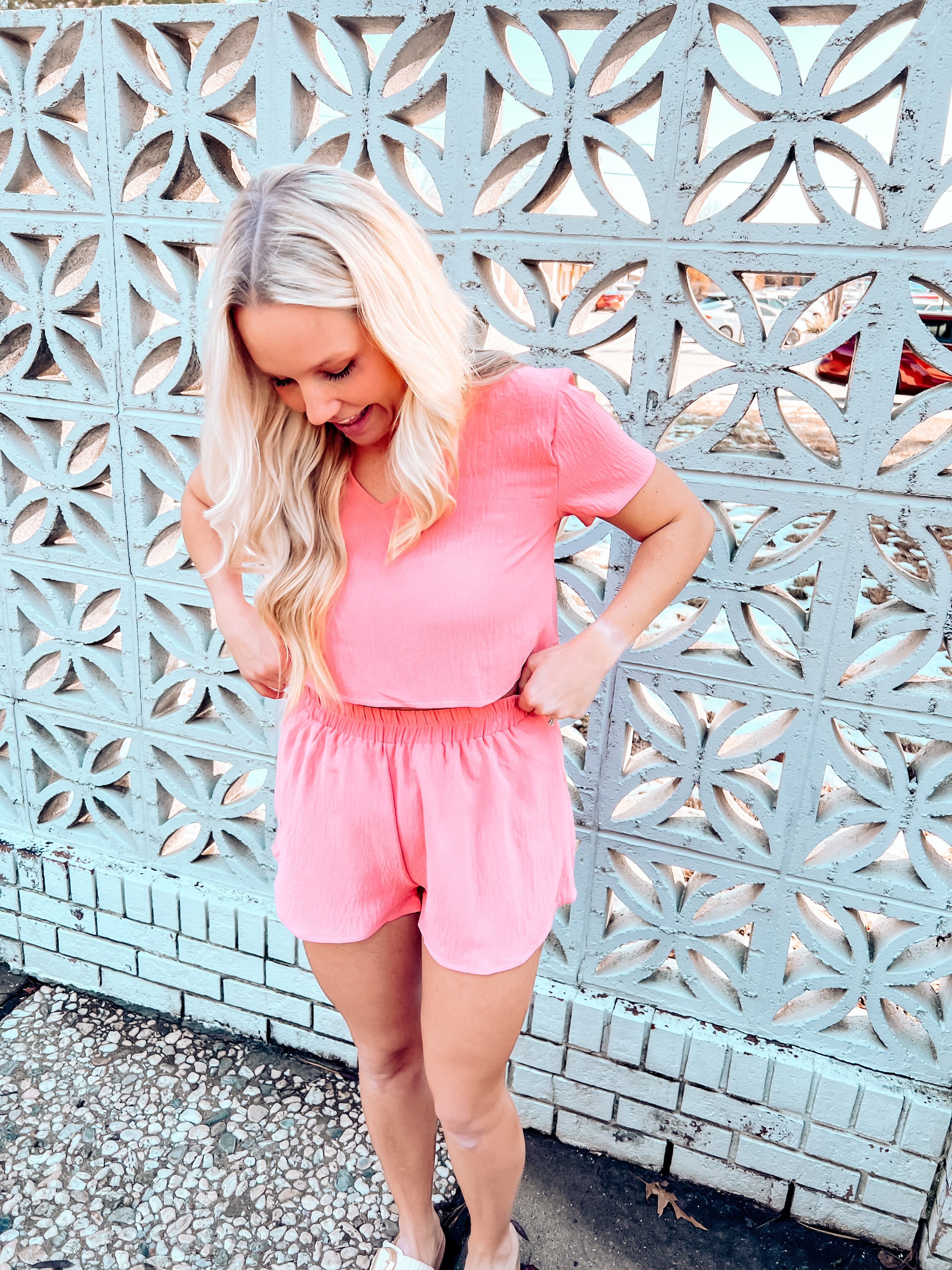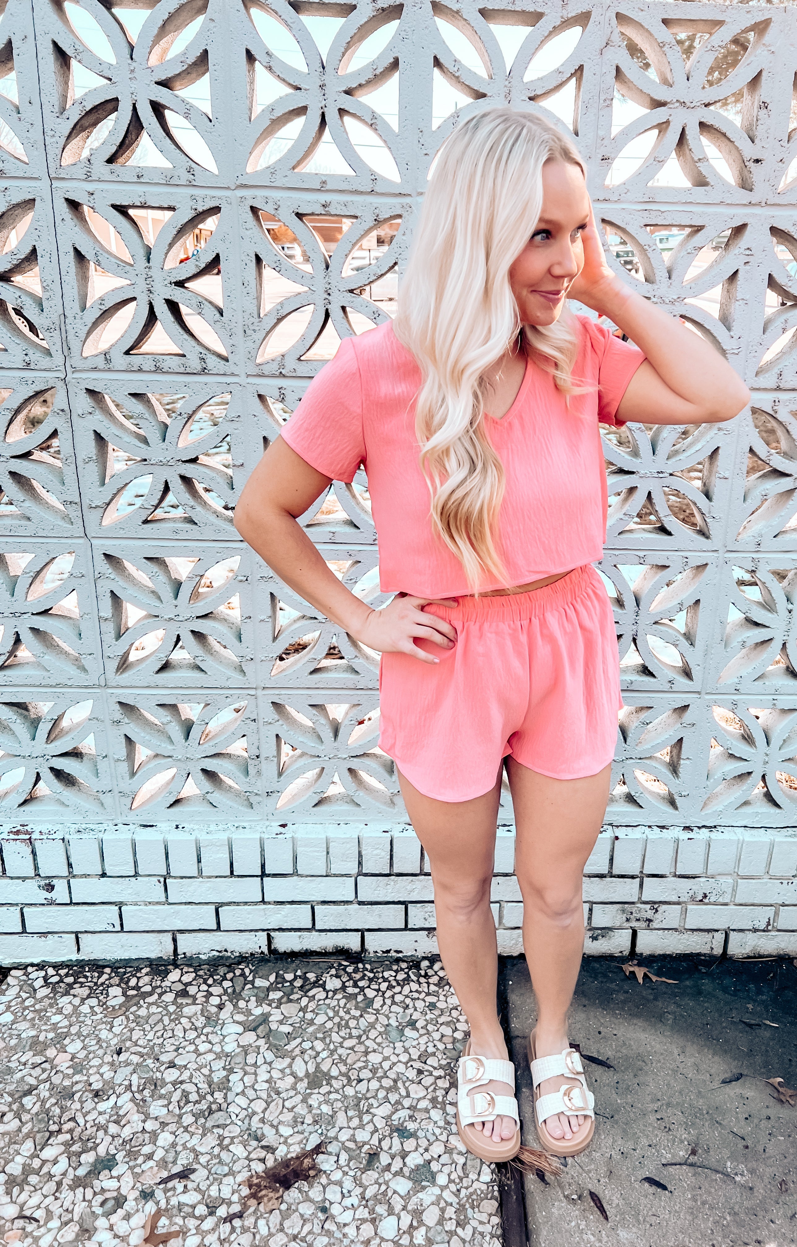 The White Sands Set in Aqua features a stylish V-neck short sleeved crop top and comfortable elastic waisted short pants. Made with high-quality material, this set provides a trendy and versatile look suitable for any occasion. Elevate your wardrobe with this must-have ensemble.