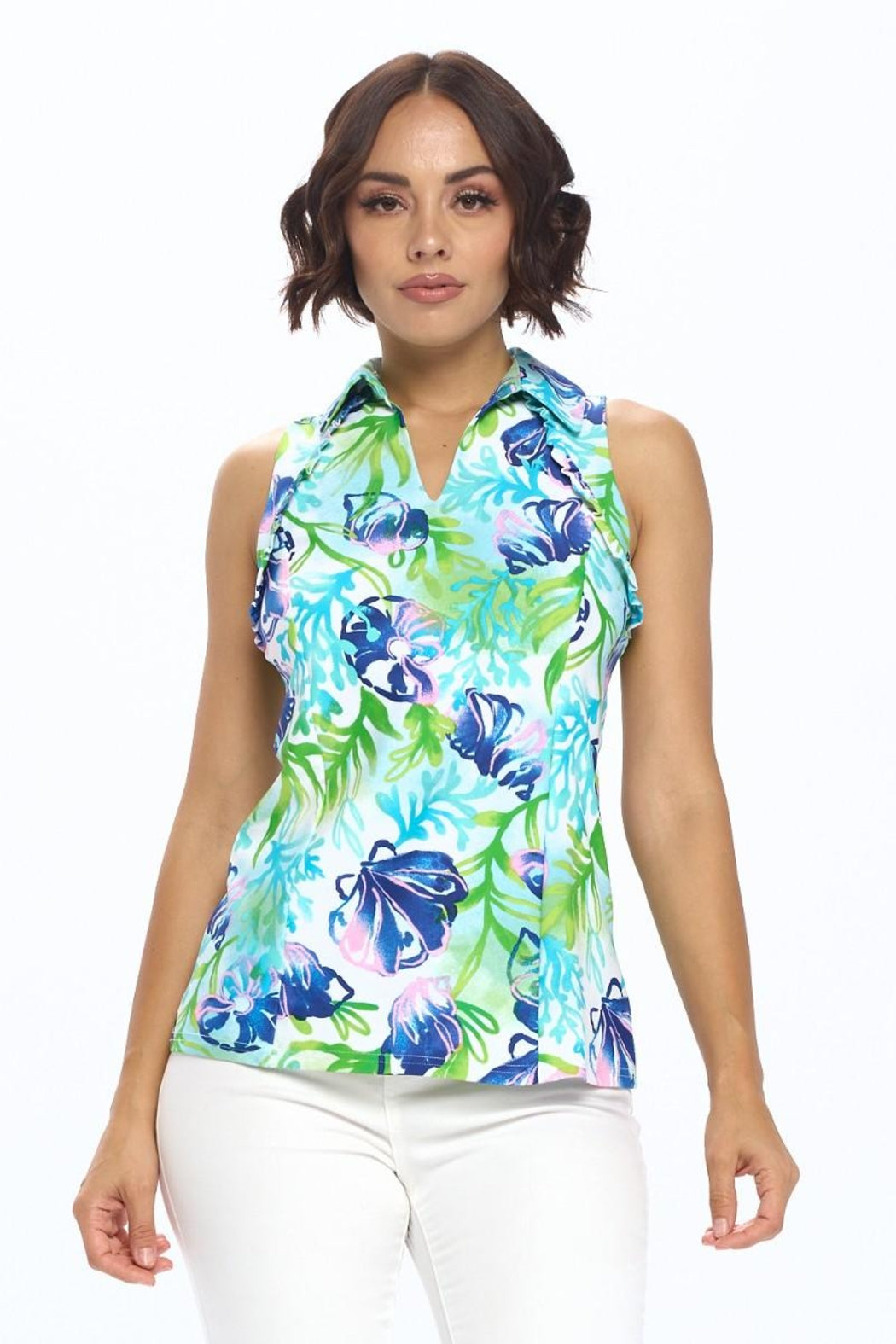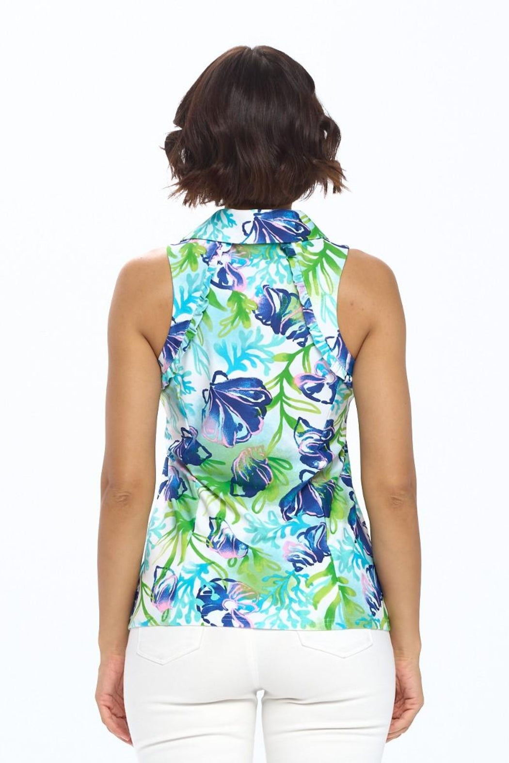 White Floral Sleeveless Polo Top with Ruffle Details. Soft & Stretchy Model Wearing a Size Small UPF+50