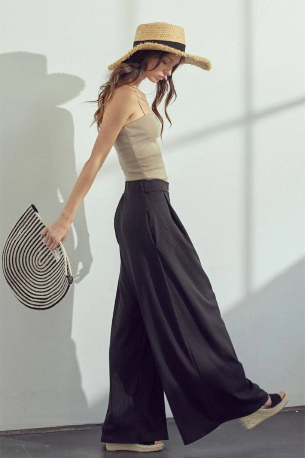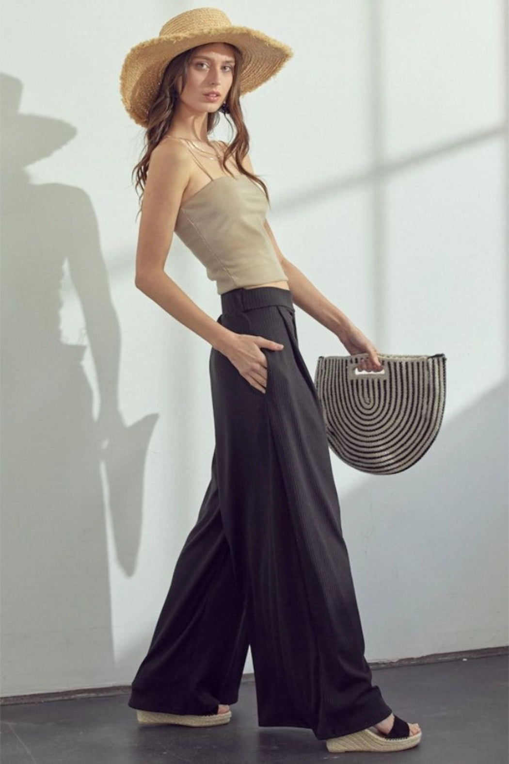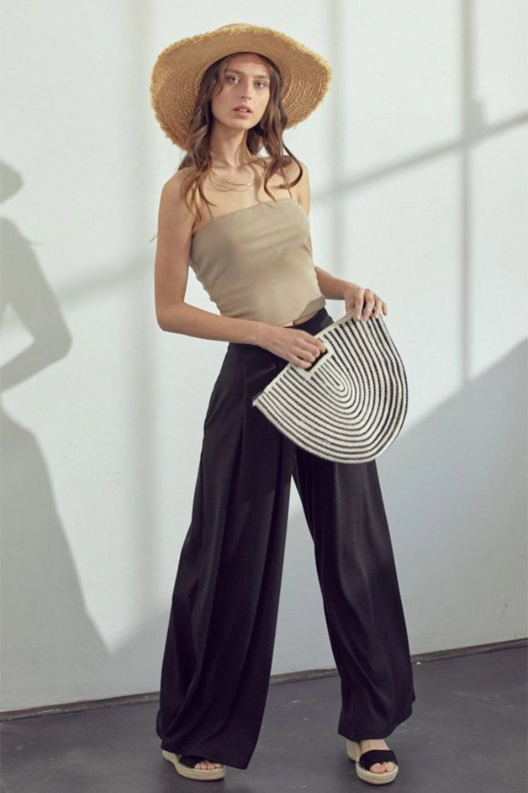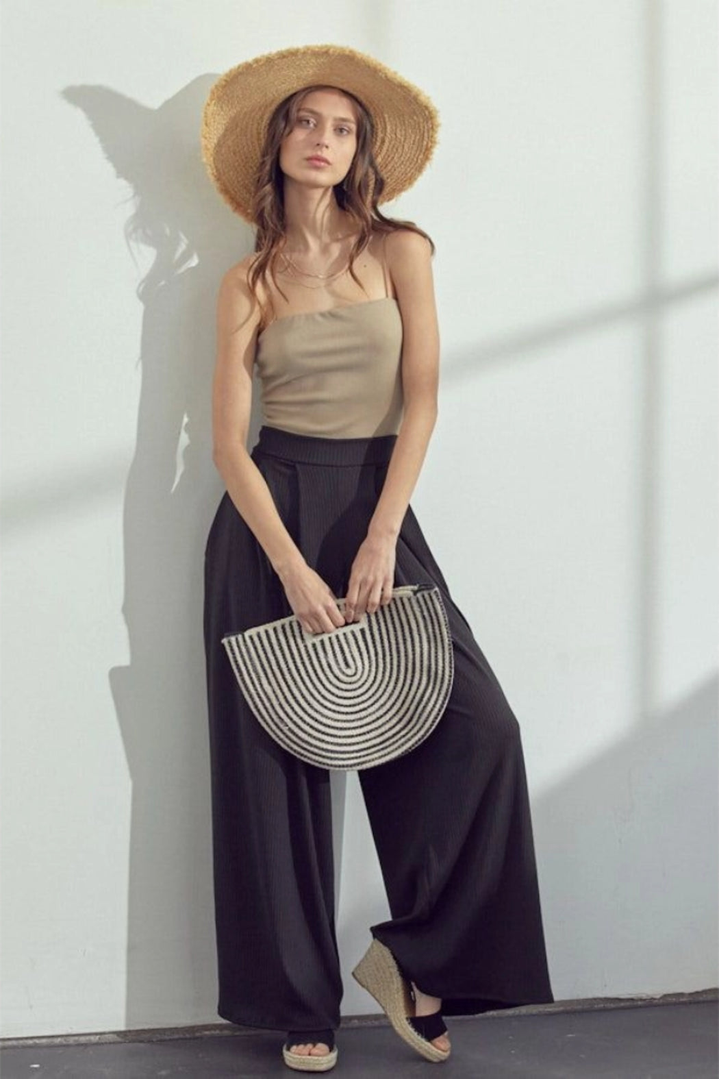 The most comfortable transitional bottoms! These pants have it all, they feature wide leg style, a high rise, elastic waistband, stretchy fabric with a beautiful drape and side pockets, unlined. These pants are a no brainer to shift into the Fall season. Wear them with a cami, a light blue denim jacket and platform fashion sneakers for a nice casual style.