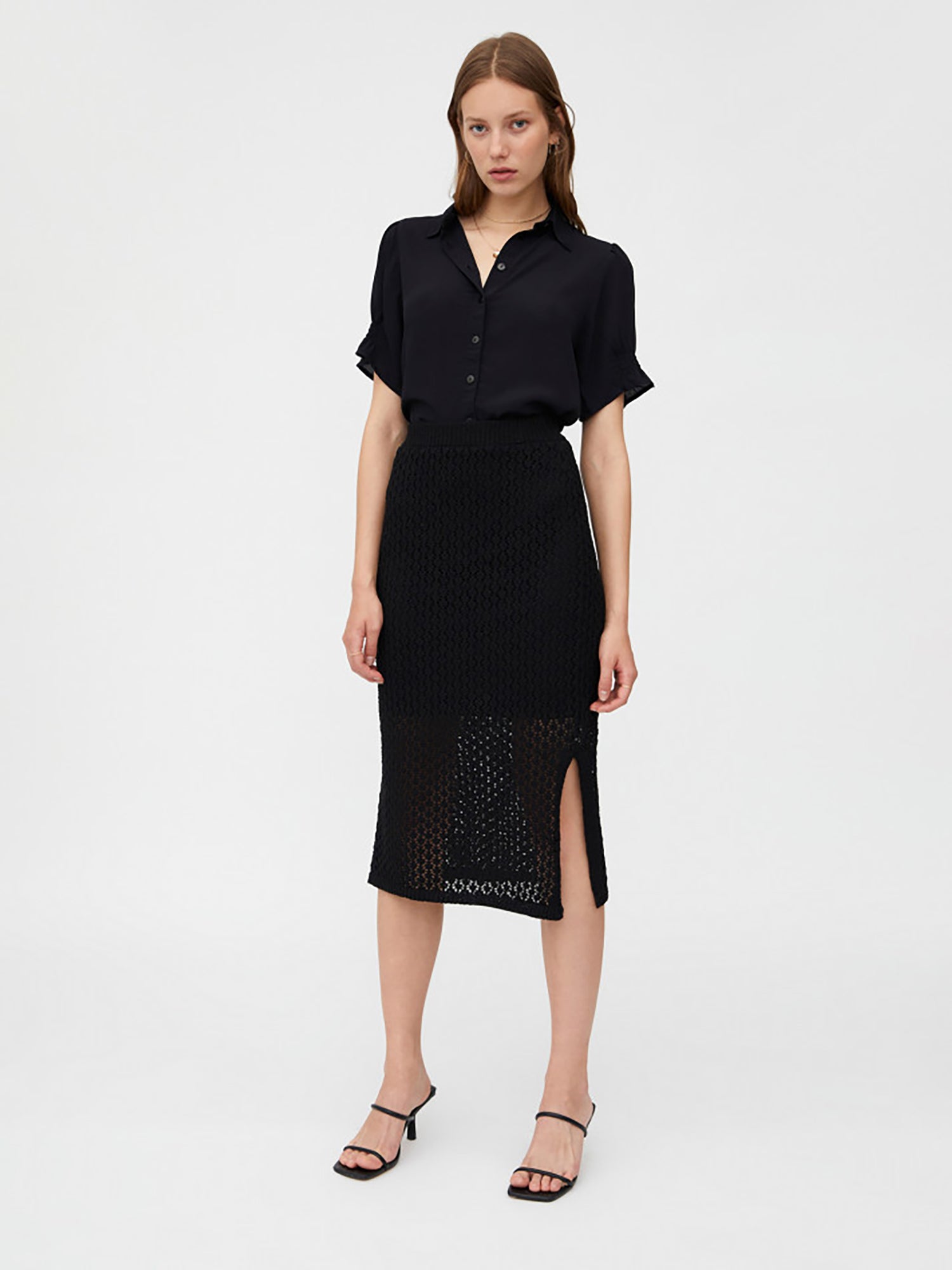 •LOOK: Wild Pony created an open weave knit midi skirt with an edge. It is midi length, has an elastic waist and a straight silhouette. Because of the open weave, it is partially lined allowing light to peek through the bottom toward the hem. There is a slit on either side for walking ease. The open weave knit is highly texturized giving a slight knobby feel to touch but the silky lining feels smooth against your skin. Wear with a fashionable sweater or cotton blouse tied at the waist. Pink Orchid has a cropped sweater from Wild Pony available to create the complete outfit. Perfect date night look.