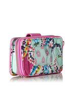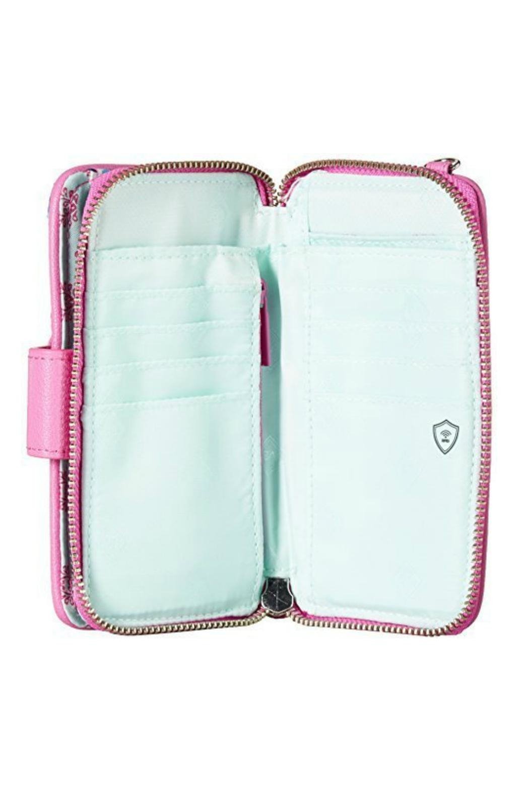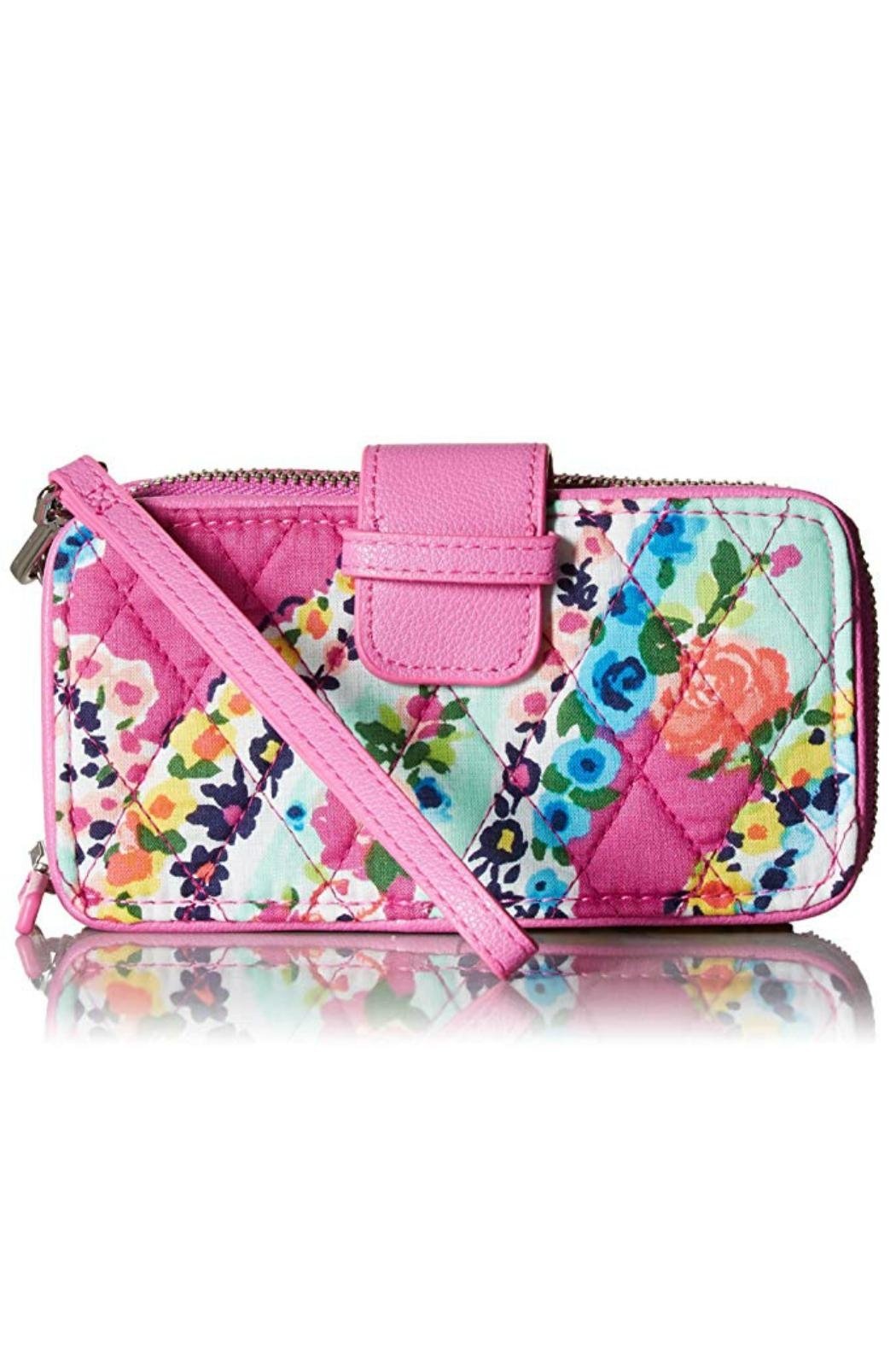Fresh and feminine, enjoy the Vera Bradley RFID Smartphone Wristlet in the Wildflower Paisley. Made of quilted cotton with vegan leather trim and a poly satin signature lining. RFID protection for all your credit and debit cards. Zipper closure. Detachable wristlet strap. Exterior back ID window. Interior slip phone pocket fits up to 6" cell phone. Eight interior credit card slots, zip coin pocket, and a bill pocket. Silver tone hardware. Pattern placement will vary. Dimensions: 6.25" wide x 3.25" high x 1.5" deep with a 7" wrist strap.