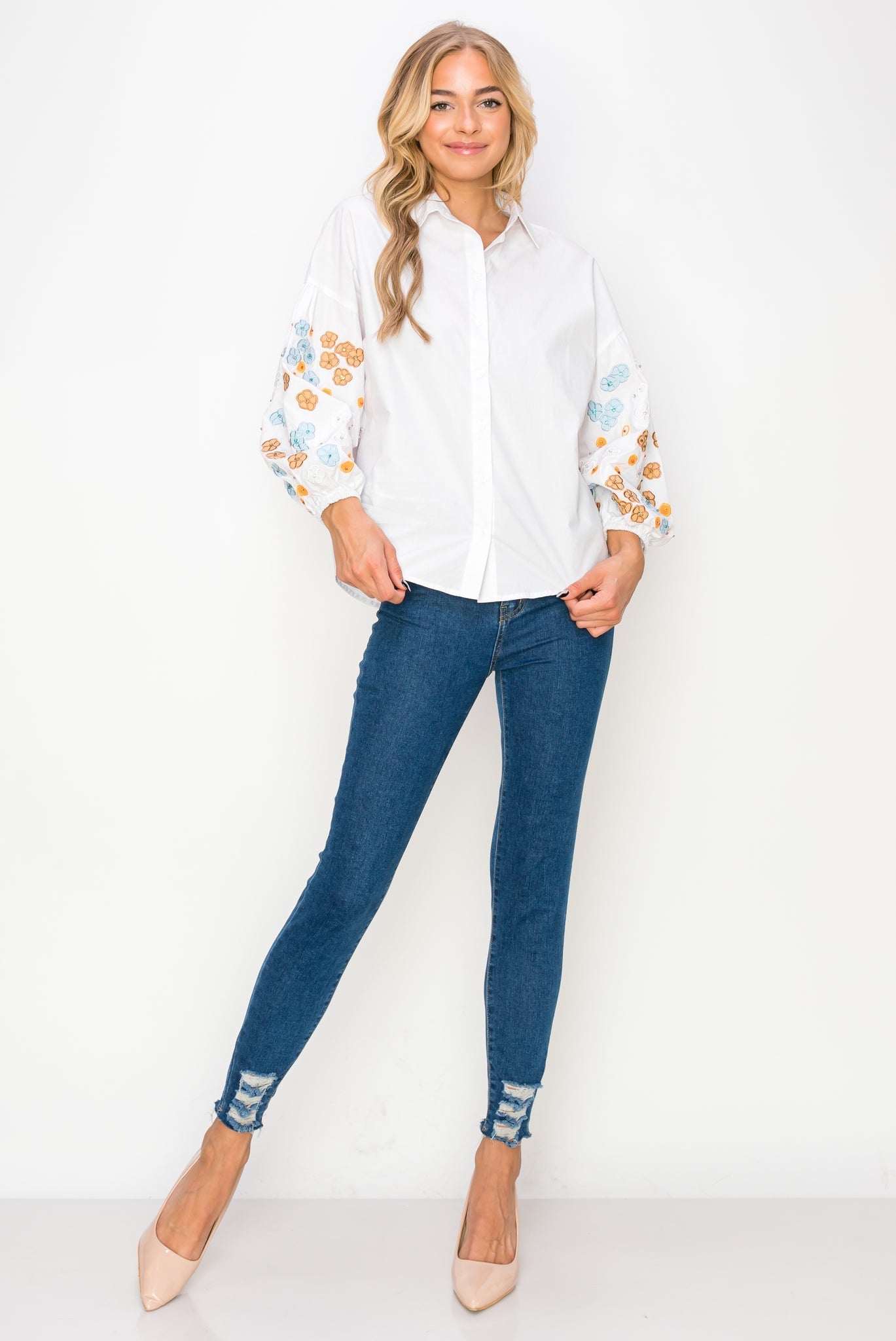 The Willow shirt. Beautifully made with high quality cotton woven and flower embroidery & sparkles. Collar front and buttons. Sleeves with elastic. Perfect for all occasions. Easy relax fit. Stylish and comfy.