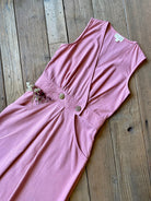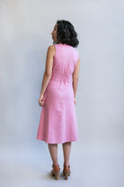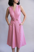 A 90's inspired look that is easy to wear and is sure to become a favorite staple in your closet. Bias binded cross over neck line and buttons at the high waist. With 2 large bamboo buttons for closure. Elastic smocking on the back for breathing and eating. Large inset pockets you could fit a puppy in. Sleeveless bias bound armholes that cleanly finishes seams. A line skirt with a little flair. Gathered at the bust for ample breast room with out being saggy on smaller boobs. Breast feeding friendly style. Structured waist band with center pleat for a comfy fit that flatters.