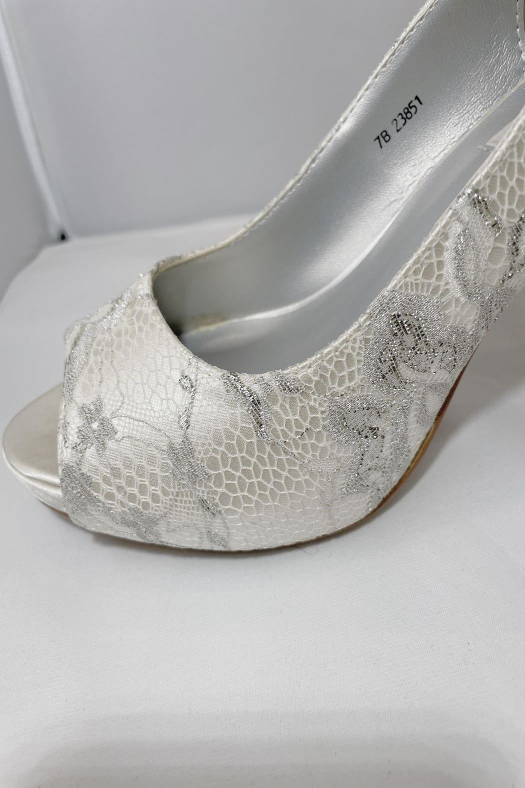 This Winter high heel shoe is the perfect shoe for special occasions. It features a 3.25" heel with a peep toe. There is lace all over the shoe with some silver detail. The heel is a little thicker to make it easier to walk in. They are an ivory color.