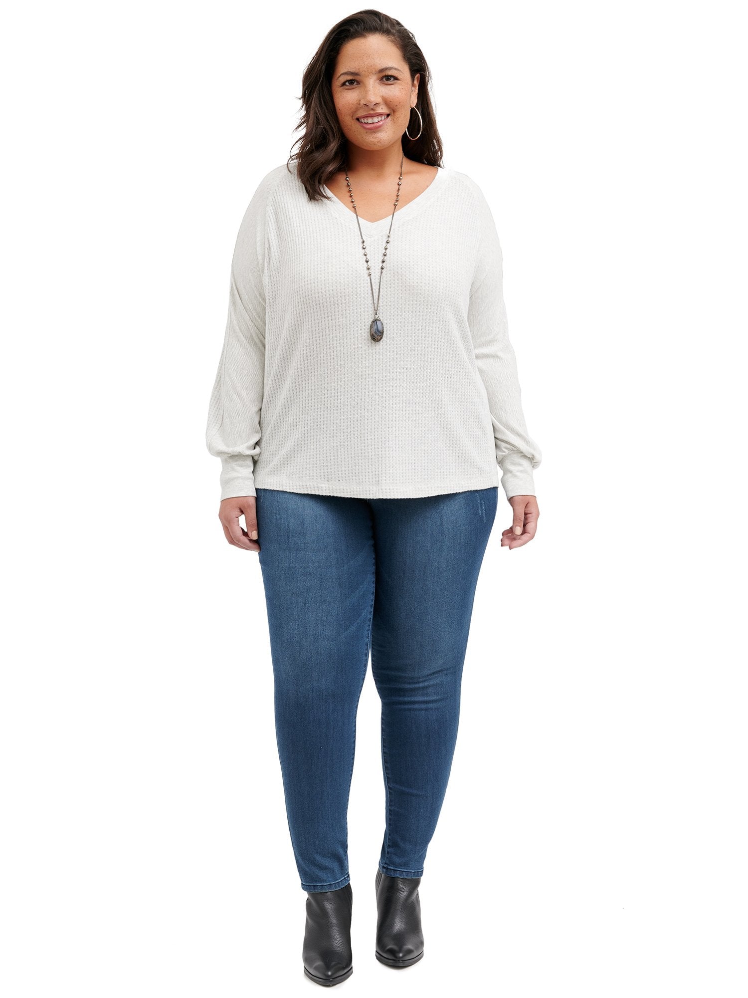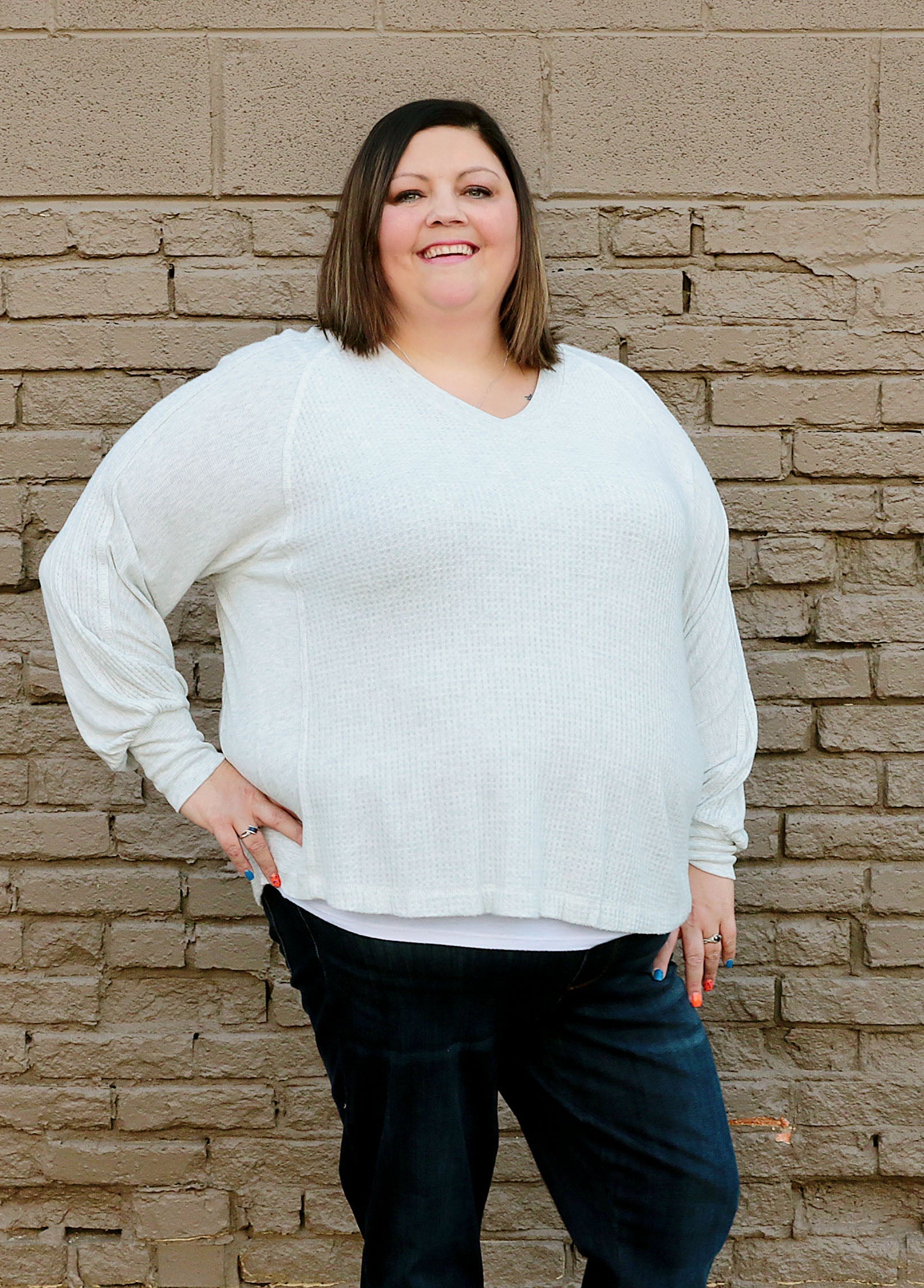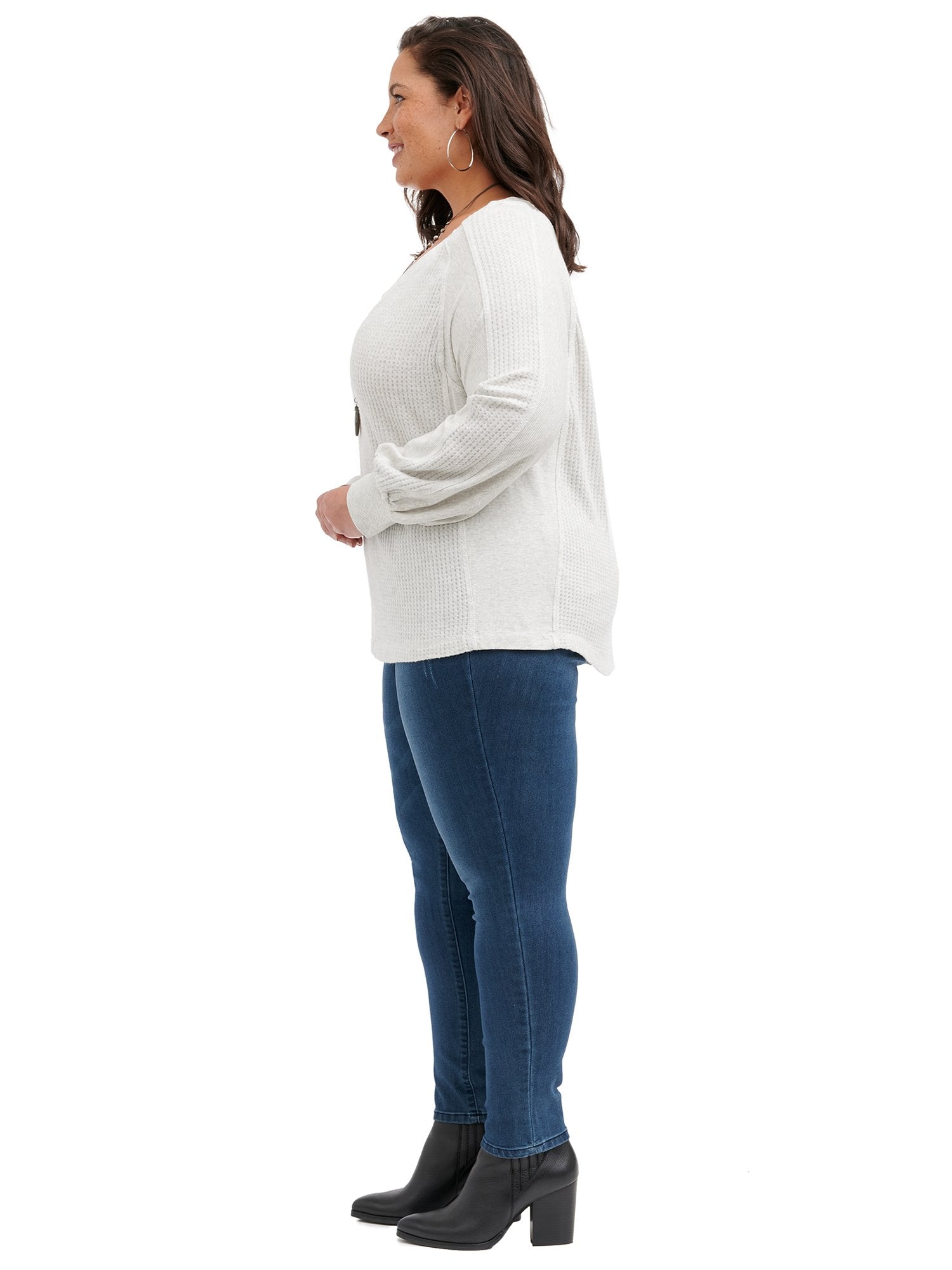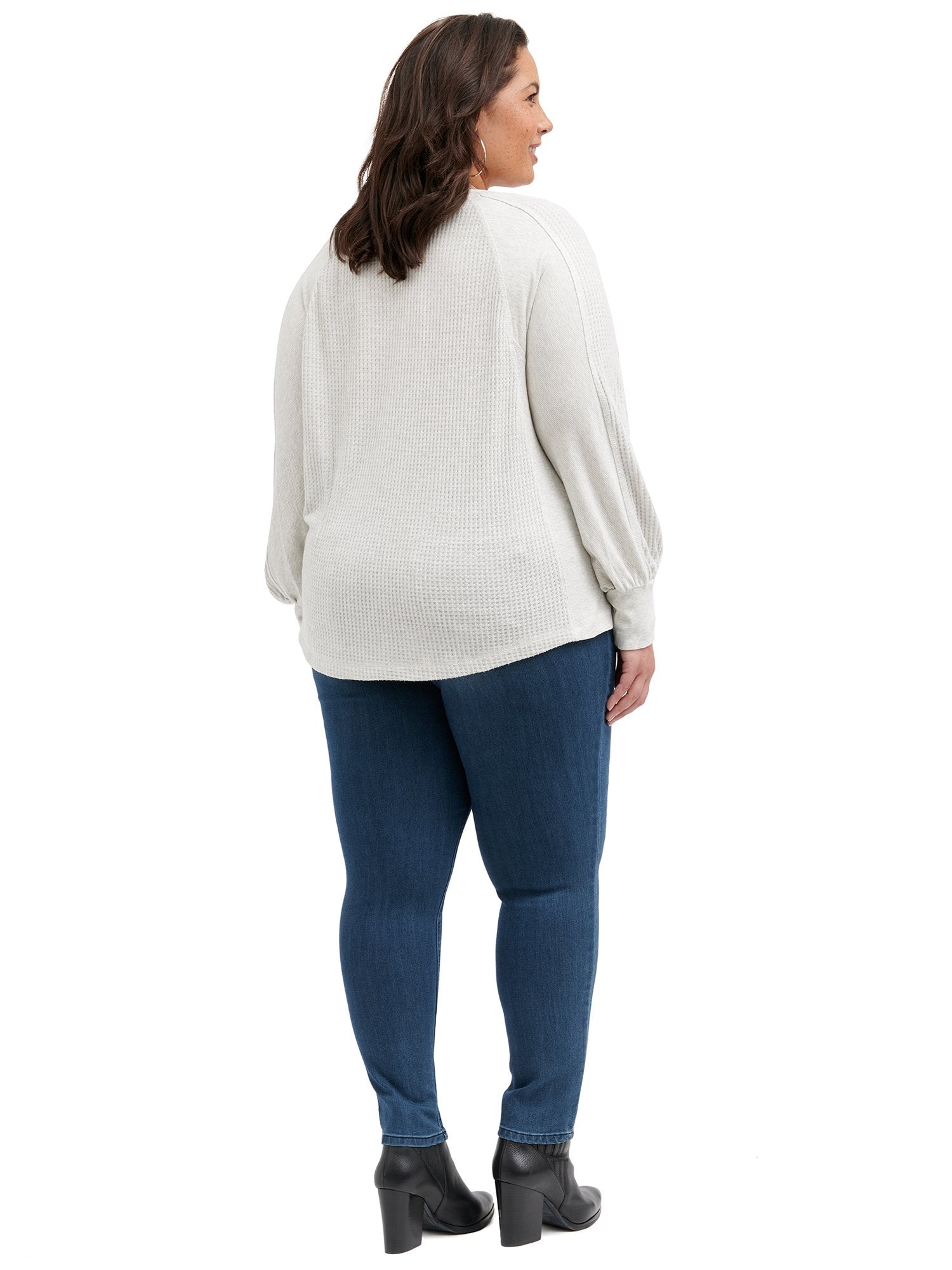 This plus-size hacci knit top is the definition of comfort and style, featuring a thermal waffle-knit design and long blouson sleeves.